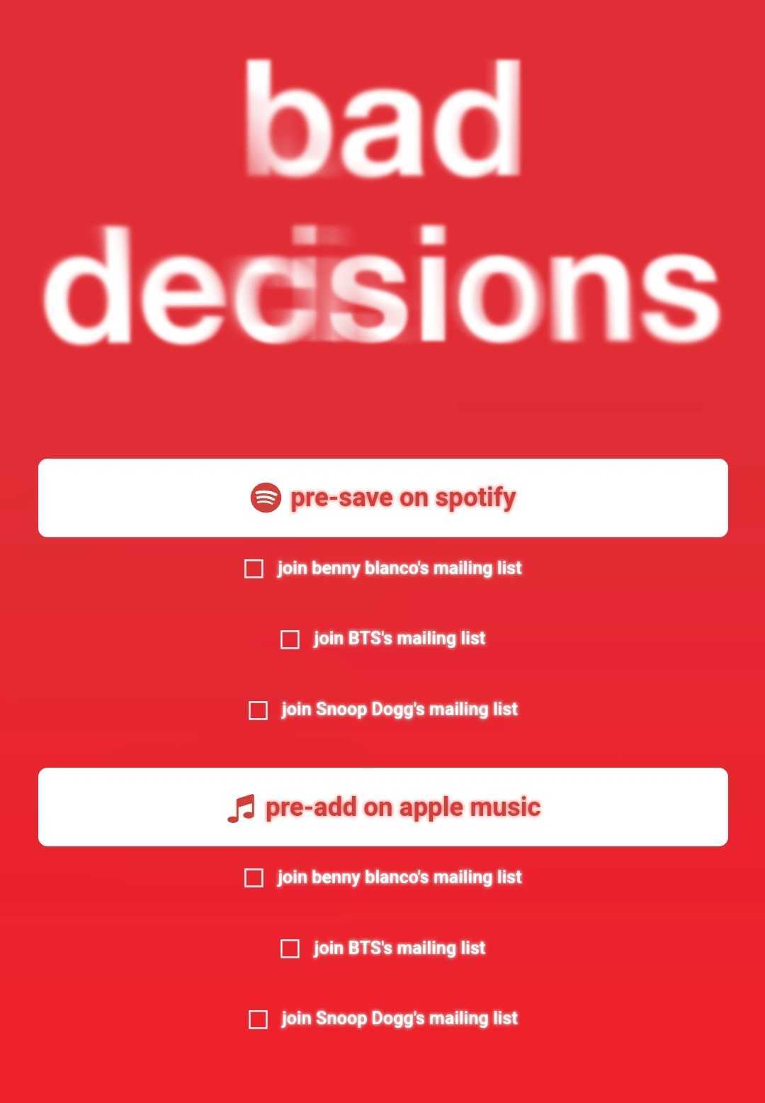 BTSのメンバーのジン、ジミン、V、ジョングクと、スヌープ、ベニーがコラボした楽曲「Bad Decisions」はMVの予告編第1弾が8月3日、第2弾が8月4日に公開され、楽曲は8月5日にリリースされる。(フロントロウ編集部)