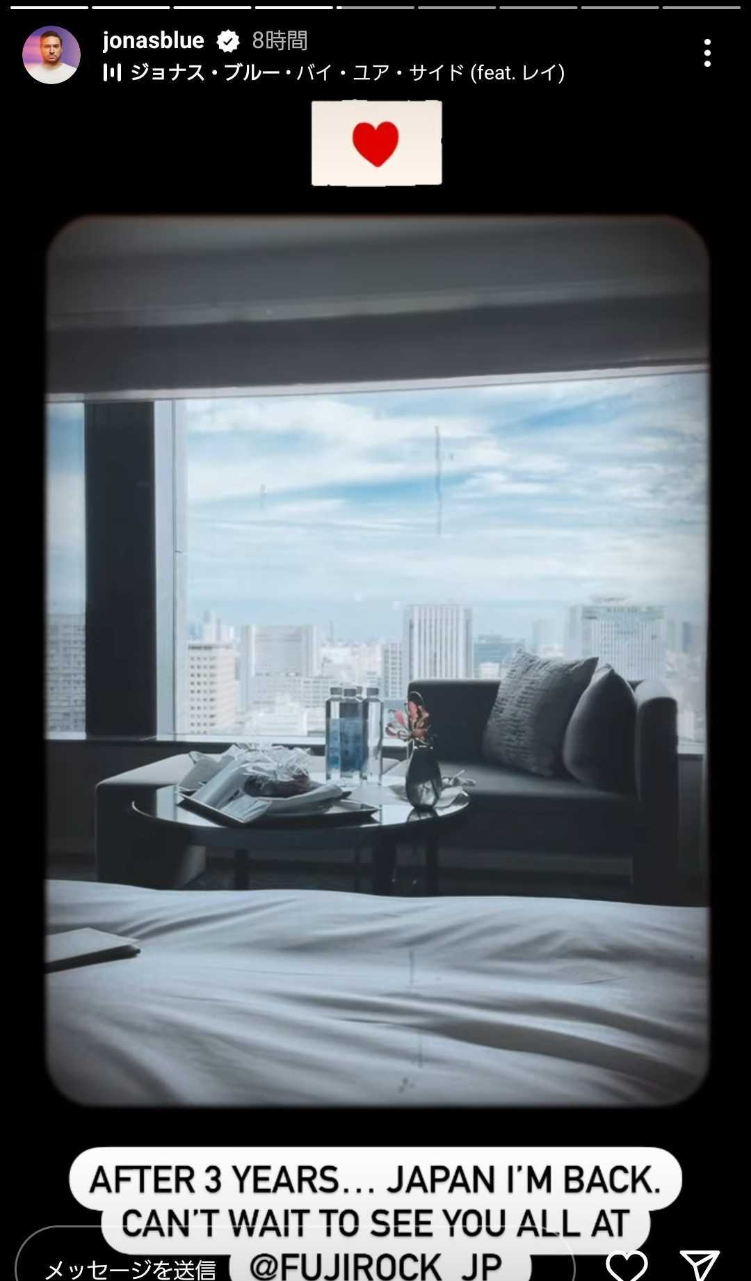 ジャック以外にも、フジロックでBE:FIRSTとのコラボステージを披露することが決定したジョナス・ブルーやボノボも来日。ジョナスは久しぶりに日本に帰ってこられたことが嬉しいようでホテルの部屋の写真をアップして、「3年経ったけど、日本に戻って来ることができた。フジロックでみんなに会えるのが待ちきれない」とコメント。