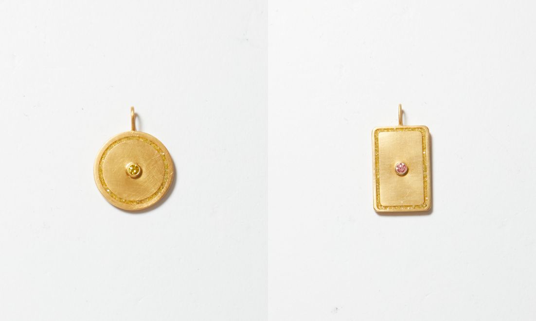 イエローとピンクのカラーラボグロウンダイヤモンドを、シンプルに一粒添えたデザイン。こちらのチャームも、ラボグロウンダイヤモンドを研磨する際に出る粉のカケラを敷き詰め縁どられている。