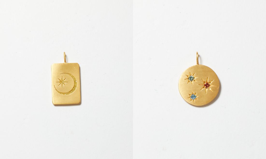 左は煌めく新月をイメージして、ラボグロウンダイヤモンドを研磨する際に出る粉のカケラを余すことなく敷き詰め、右は3色のカラーラボグロウンダイヤモンドを星に見立て、煌びやかなチャームに。