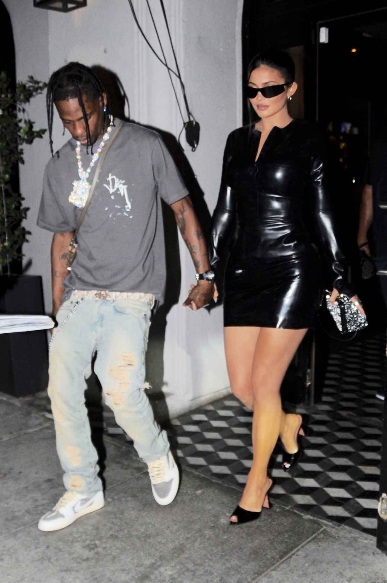 ウェスト・ハリウッドで恋人のトラヴィス・スコットとデートを楽しんでいたカイリー・ジェンナーは、1枚でキマるラテックス素材のミニワンピースを着用。存在感たっぷりなブラックワンピースにヴェルサーチェ(Versace)のサングラスを合わせ、エッジを効かせたスタイルに。