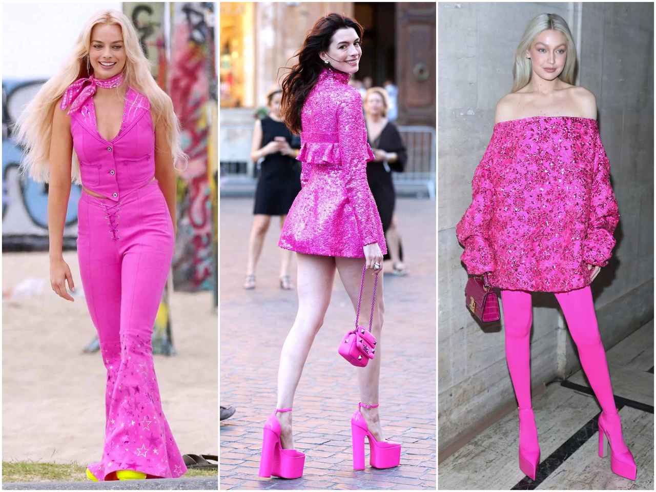 左から俳優のマーゴット・ロビー、俳優のアン・ハサウェイ、モデルのジジ・ハディッド