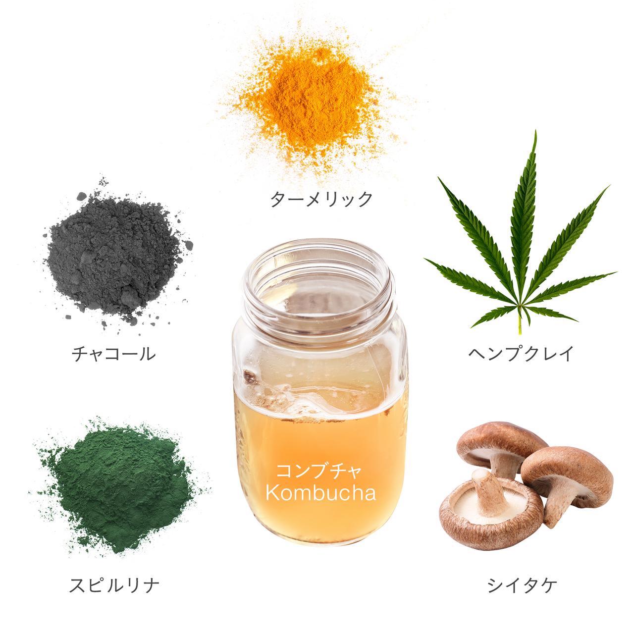 スーパーフードのターメリック※2、スピルリナ※3、シイタケ※4や、自然由来のヘンプクレイ*5やチャコール*6など厳選された素材を使っており、コンセプト素材である「コンブチャ※」と相性の良い成分を組み合わせている。