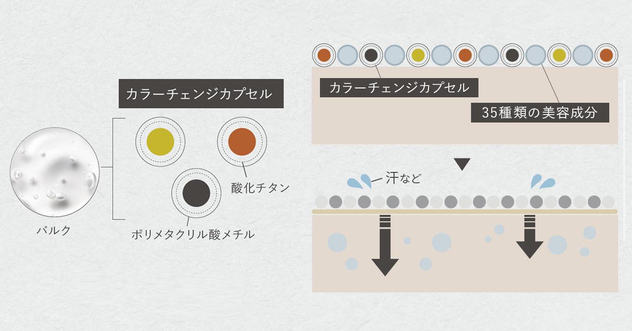 一般的なファンデーションとは異なり、「CICA FECTOR」は透明なジェルをベースとし、微細なカラーチェンジカプセルを配合。カプセルが肌の上で弾けて混ざり合うことで、オークルカラーへと変化し、顔色のムラなどを埋め自然にカバーしてくれる。