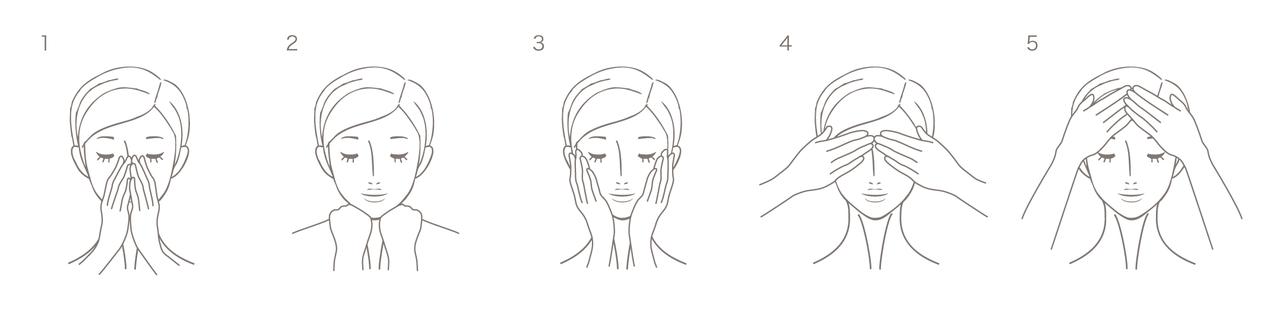首の付け根部分に両手を置いて3回深呼吸し、顎のラインから頬を両手で包み込んで再び3回深呼吸。続けて、頬骨~目の周りなどを手の平全体で包み込んで3回深呼吸し、最後に額に手を当てて、3回深呼吸する。こうすることで、肌を保湿しながら、心までリラックスした気持ちが味わえるはず。