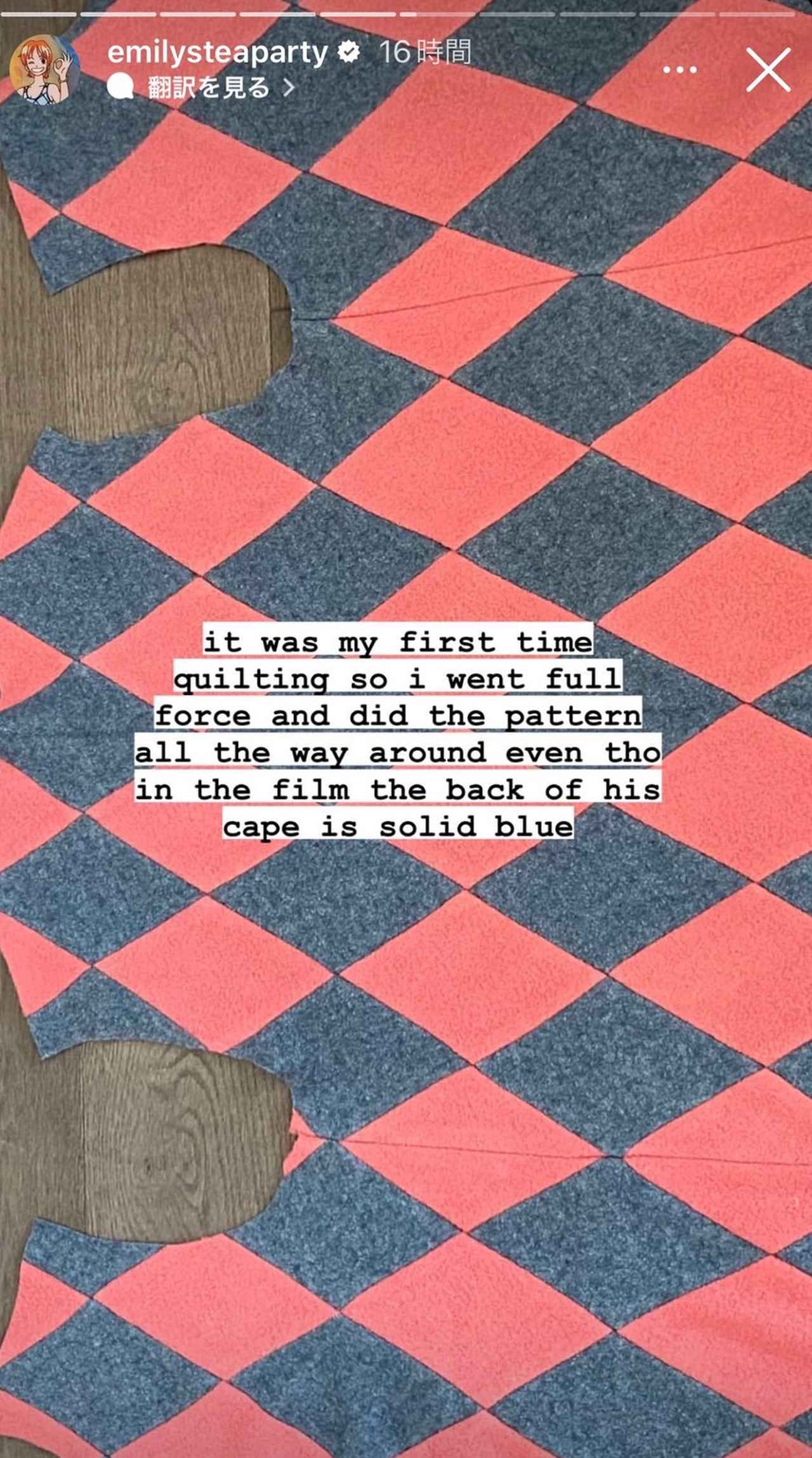 『ONE PIECE』以外にも、日本のアニメを幅広く観ていることで知られるエミリーが今回手作りしたのは、ハウルが作中で羽織っている、赤みがかったピンクと青っぽいグレーの格子縞模様のジャケット。今回が初めてのキルティング作業だというエミリーは、まずは2色の生地で模様を作るところから始めたという。