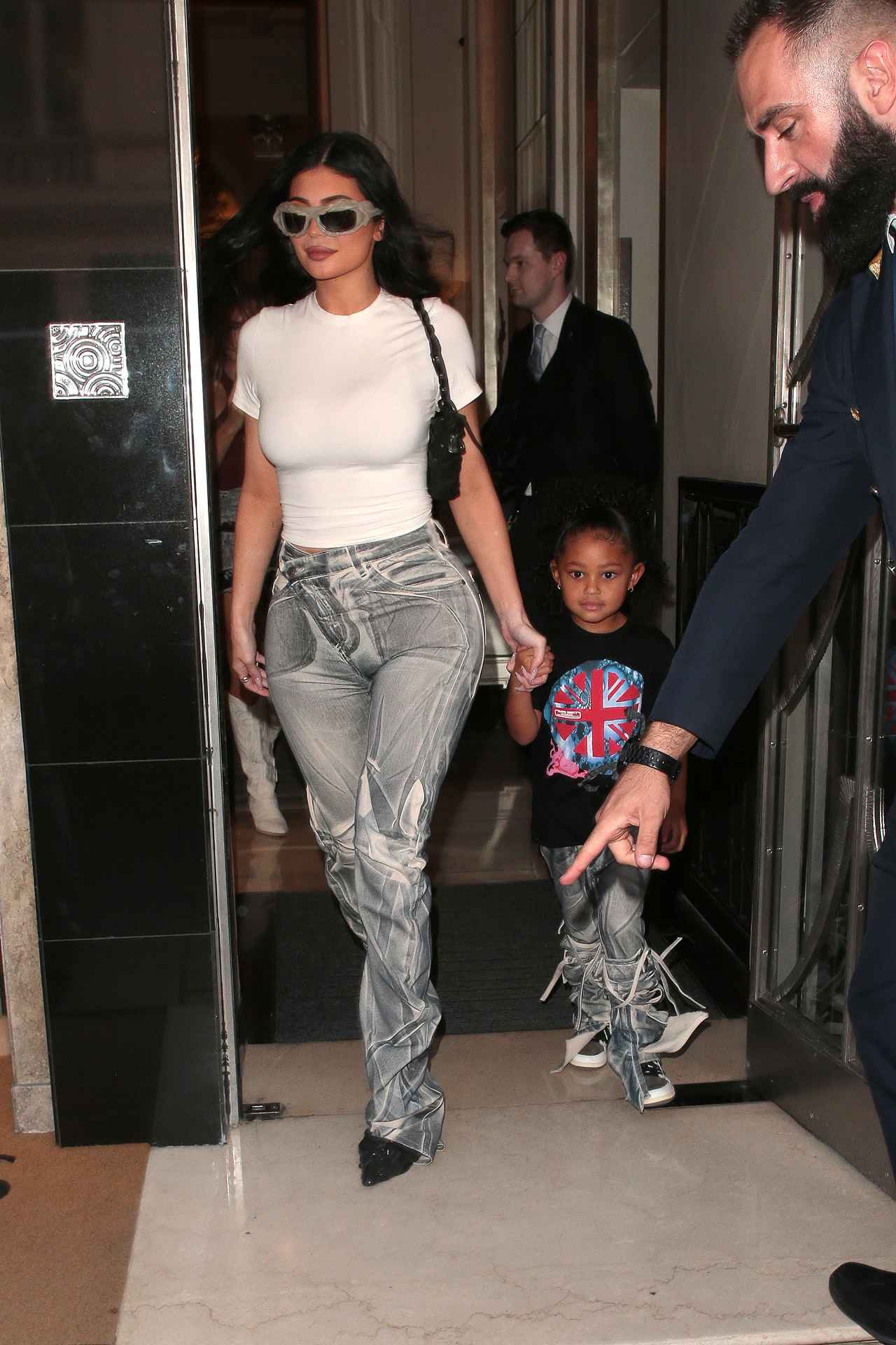 Ottolingerのデニムでおソロいにしたカイリーとストーミ。カイリーが着るトップスは、姉キム・カーダシアンがプロデュースするSKIMSのもの。