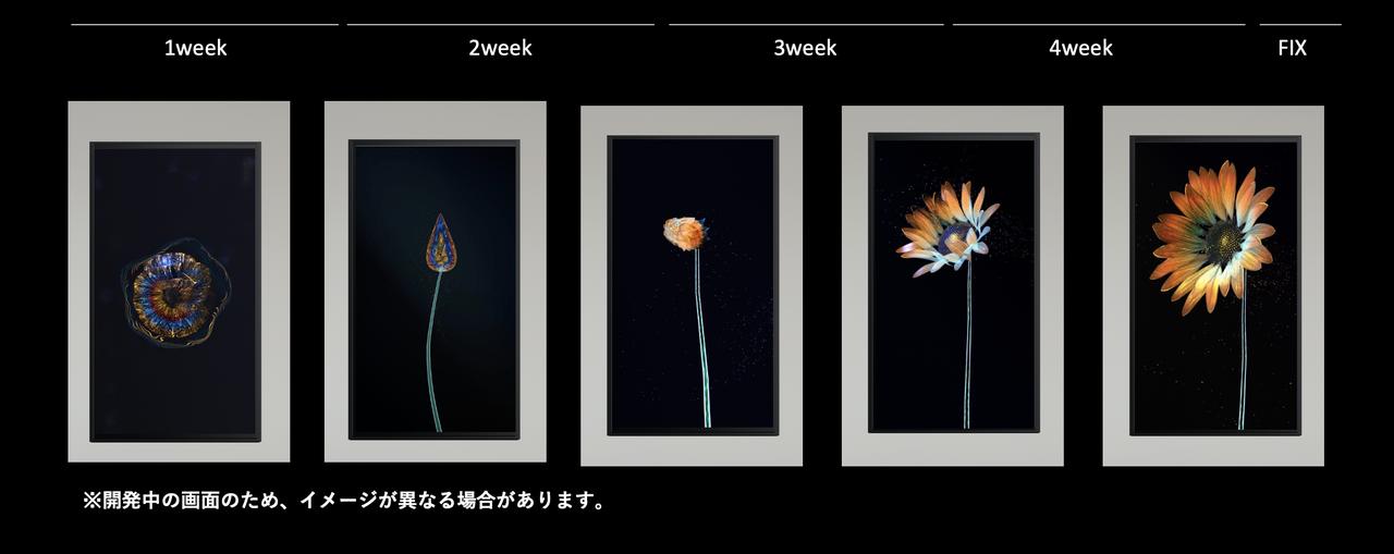 毎日リアルタイムで「感情」を吸収し、取得した感情は発育形状ごとの色相になって反映。最終的な感情の総量で成長後の花の形や色が決定するという。