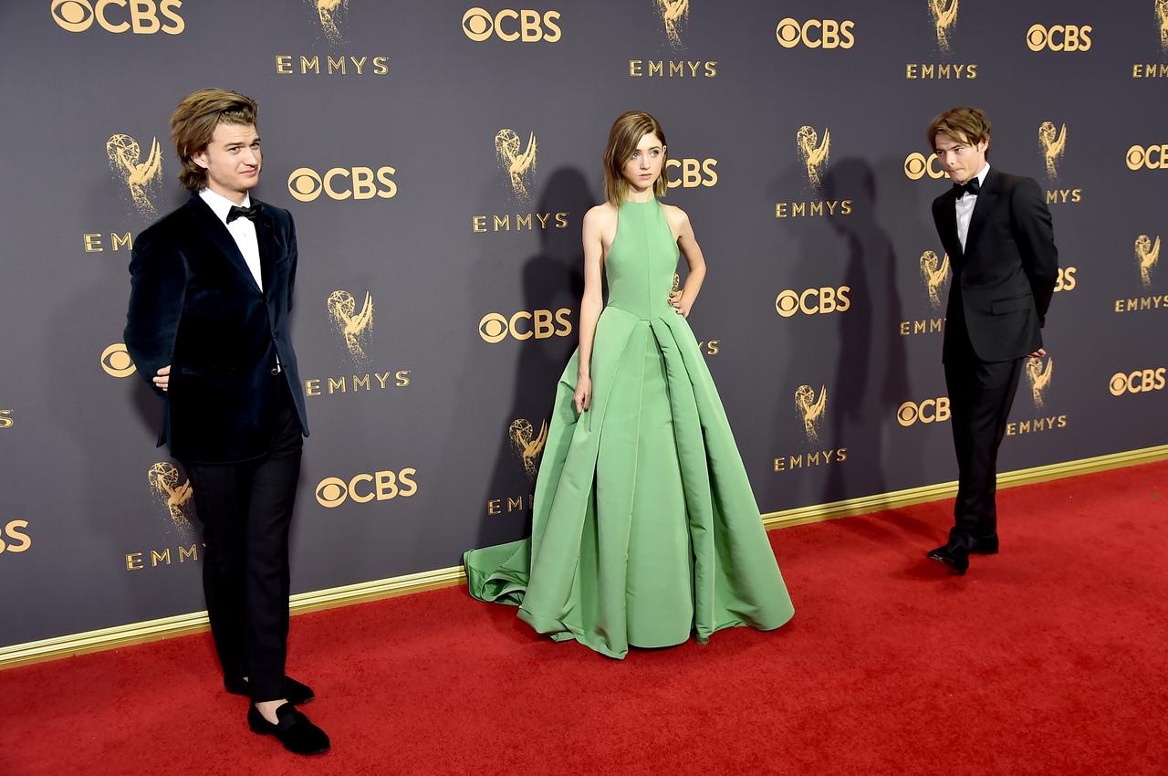 左からスティーブ役のジョー・キーリー、ナタリア・ダイアー、ジョナサン役のチャーリー・ヒートン。ナタリアとチャーリーは現実でも交際している。