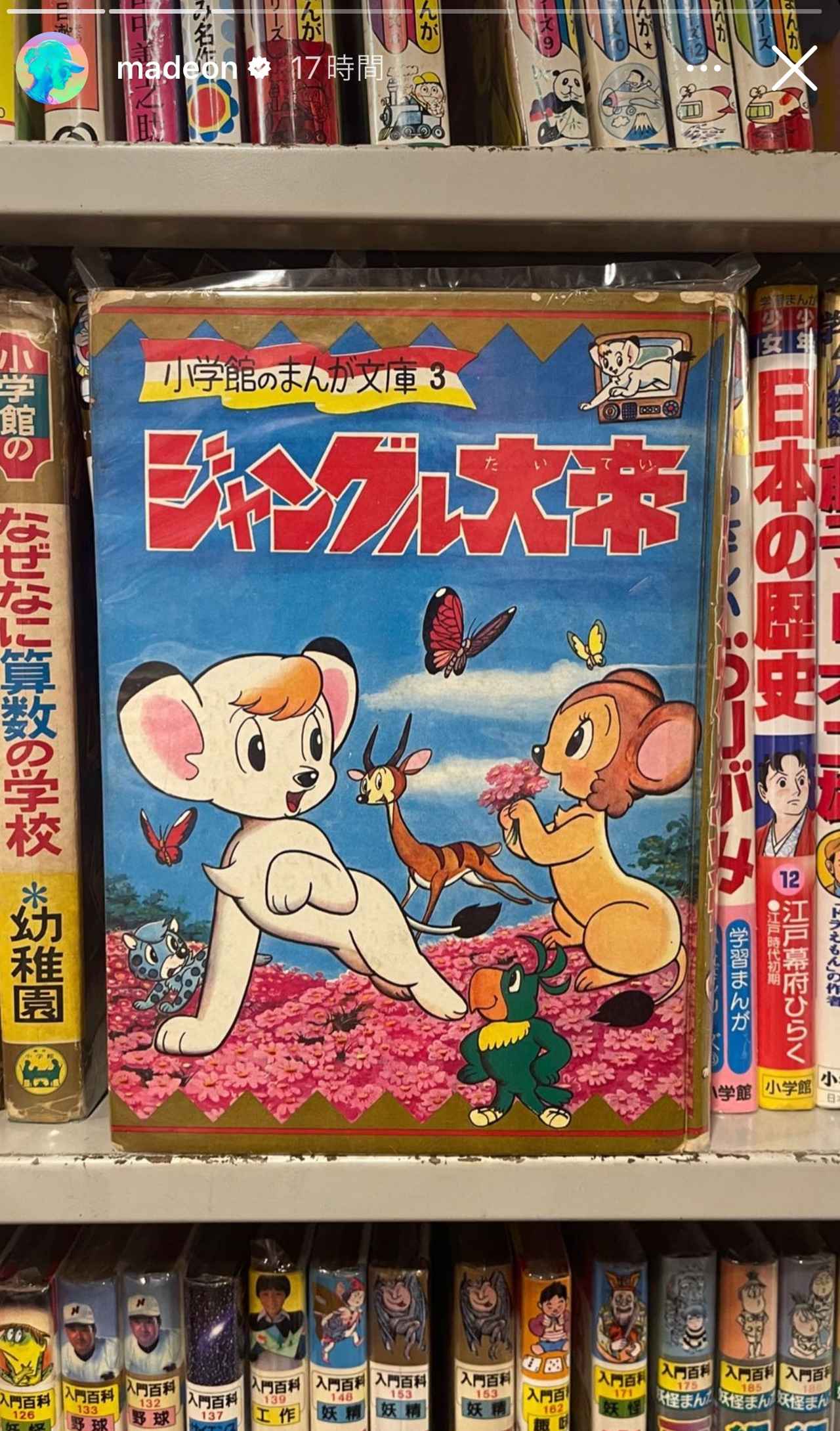 久しぶりの日本での滞在を満喫しているマデオンは、特にレトロなアイテムのショッピングを楽しんだようで、発見したアイテムの写真をインスタグラムストーリーズにアップした。まずマデオンの目に留まったのは、手塚治虫原作の『ジャングル大帝』の文庫本。