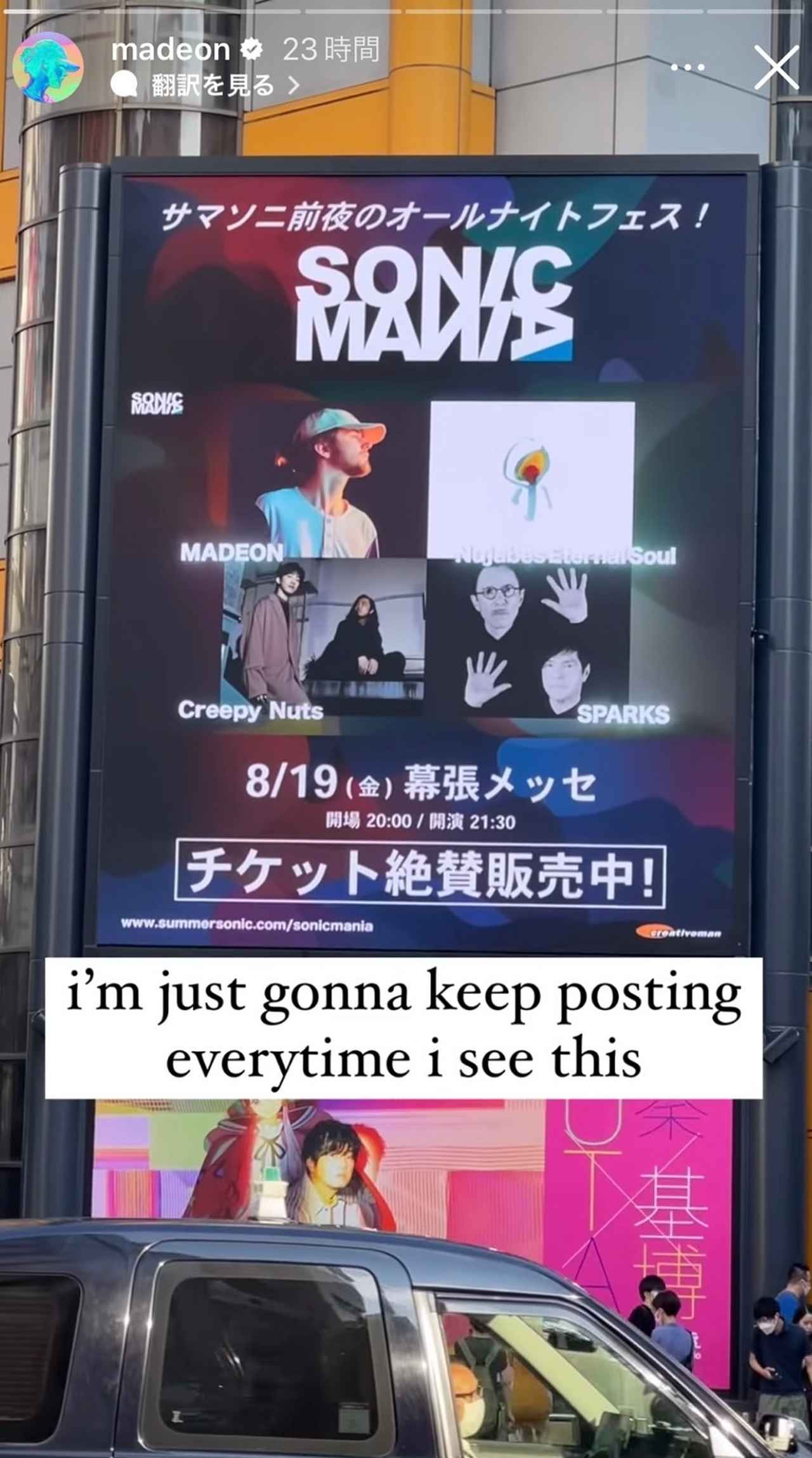 日本に到着したマデオンは、現在はもっぱら観光を楽しんでいるよう。ソニックマニアへの出演は2015年以来7年ぶりとなるマデオンは、日本各地で自分の名前も載ったソニックマニアのポスターが掲出されていることが嬉しかったようで、ポスターを見つけるたびに写真に収めているとインスタグラムストーリーズで明かしている。
