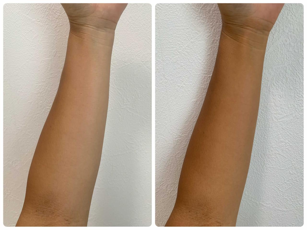 これまでセルフタンニングを使用してきて、小麦肌にはなるものの少しグレーがかったようなカラーになるなど、実際に日焼けしたようなリアルな色合いにならないことも多かった。でも「インスタント ブロンズ ジェル」はどう見ても本物!というようなリアルな仕上がりで、むしろ肌のツヤ感もアップ。
