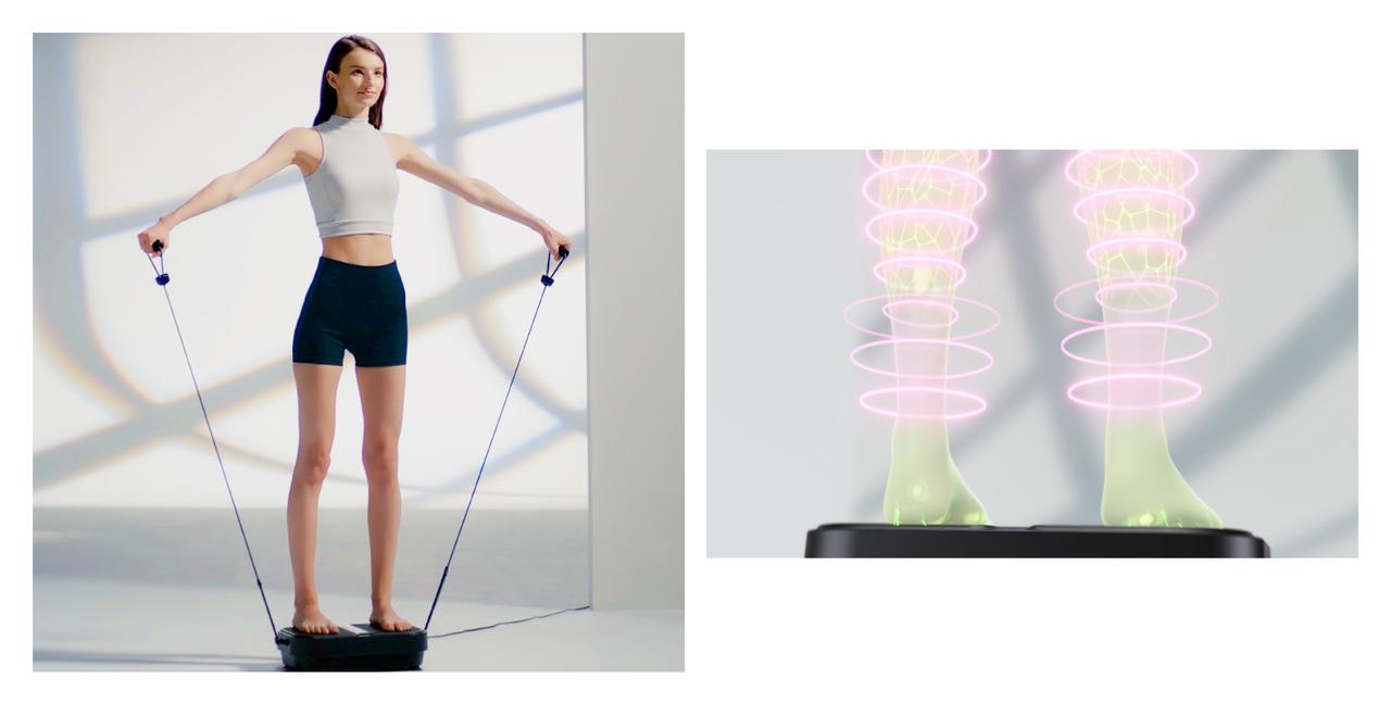 パワフルに体幹へアプローチする「振動」、効率的に筋肉を鍛える「EMS」、そしてエクササイズをより効果的にする「温熱」の3つの機能を搭載。「振動」で有酸素運動をしながら、「EMS」で負荷をかけて筋肉を収縮し、「温熱」で足裏から温めながら刺激することで、身体が温まりやすくなり、エクササイズをより効果的に。