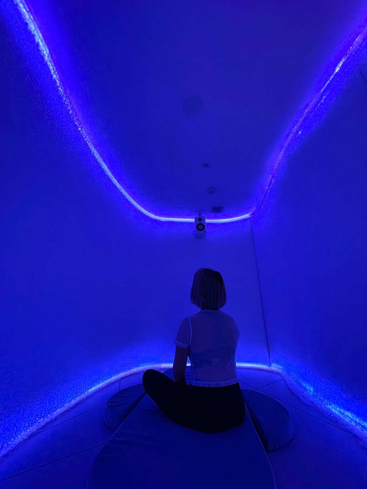 まずはさまざまなカラーに移り変わる光に包まれながら寝そべり、音声ガイダンスに従って呼吸や全身の感覚にフォーカス。普段の瞑想では集中力が続かないことも多いけれど、いつもとは異なる空間で光に見とれているうちに、徐々に邪念が浮かびにくくなっている。