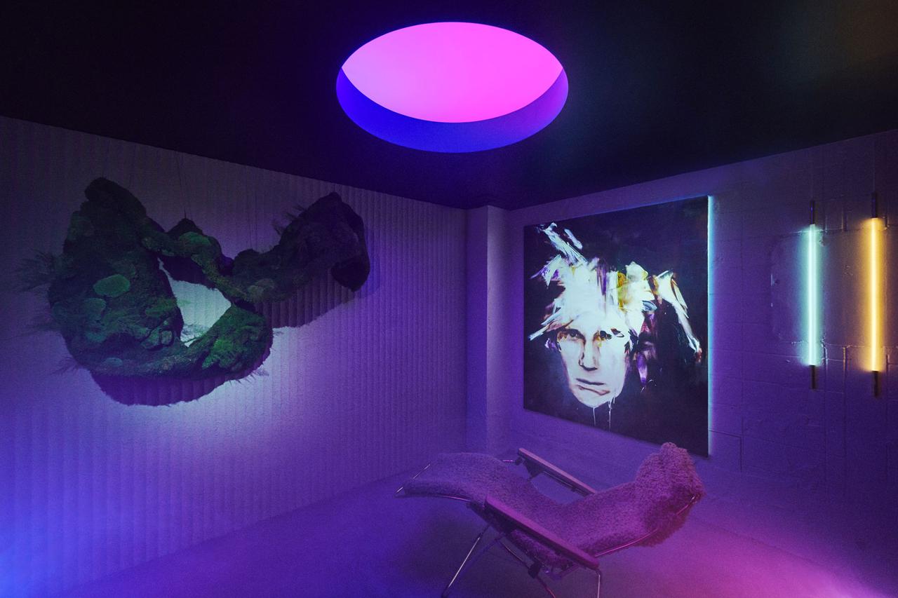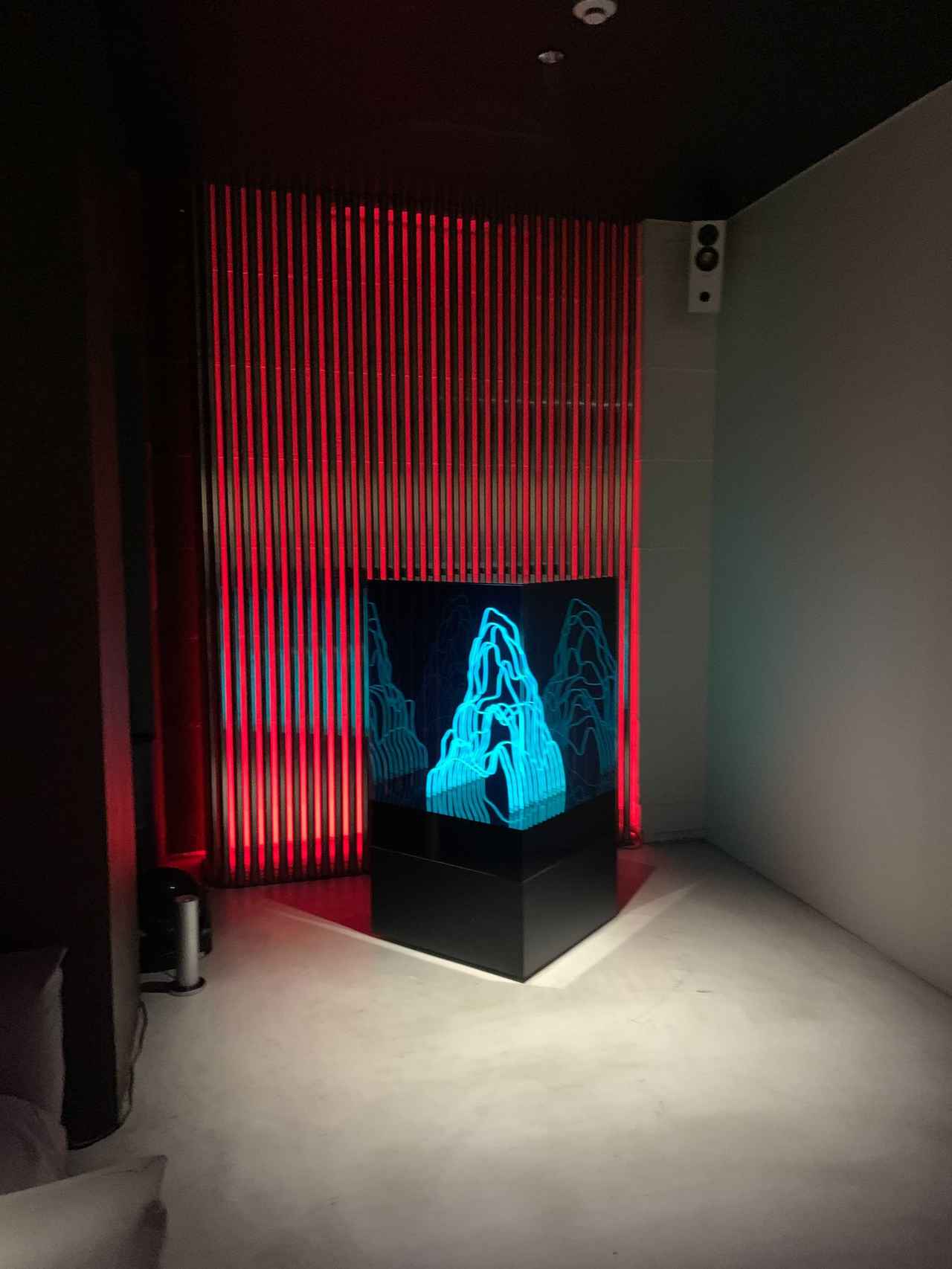 リラックスできる姿勢がとれるチェアに座りながら、ネオンや絵画などの美しいアート作品を鑑賞。流れる音でもリラックスできるこの空間で、少しぼーっと過ごし、アートのエネルギーを体感した。