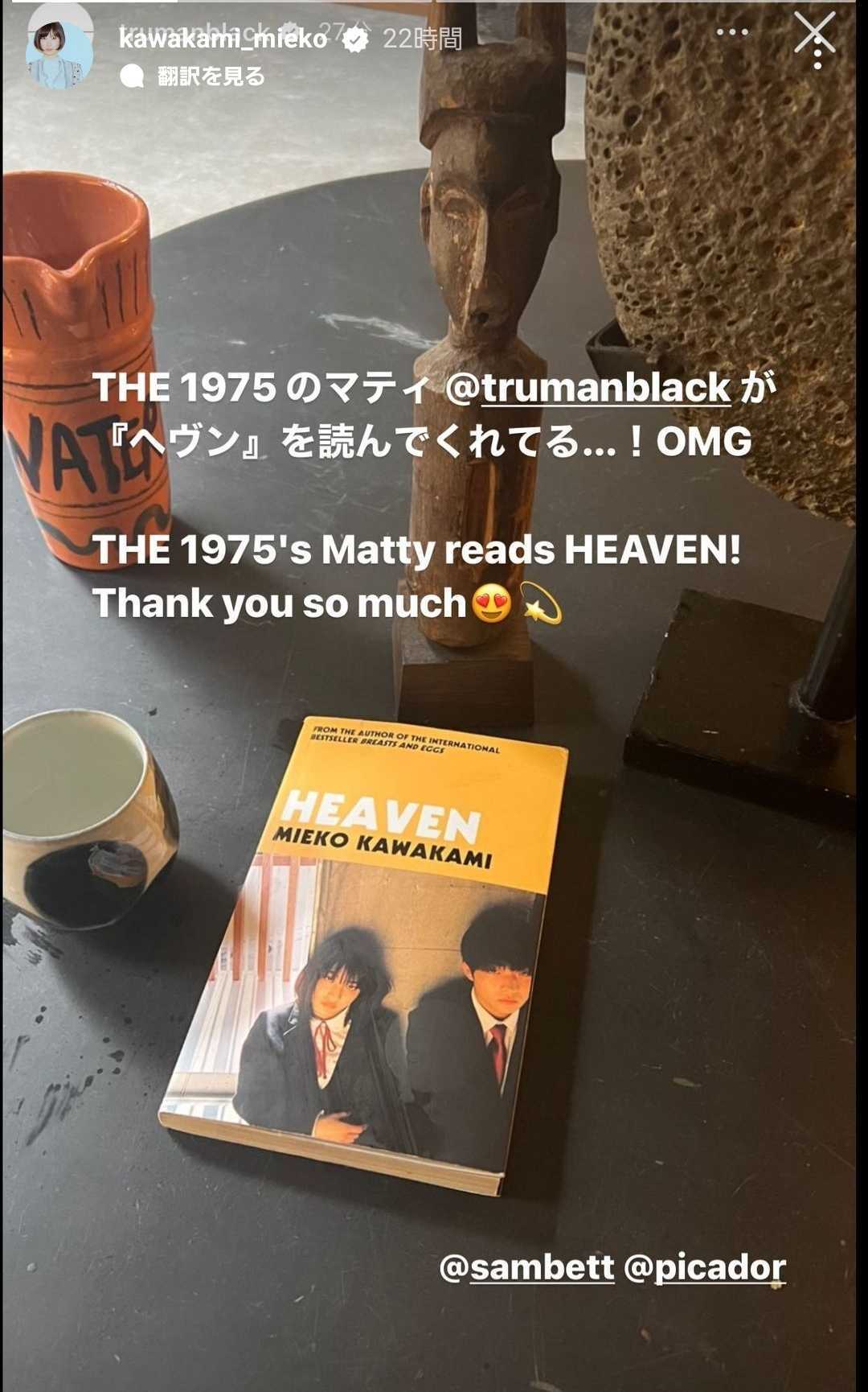 マティはそんな『ヘヴン』を愛読しているようで、その様子を自身のインスタグラムで紹介。すると、その投稿を見た川上未映子氏が、「The 1975のマティが『ヘヴン』を読んでくれています。ありがとうございます」と同じくインスタグラムで反応した。
