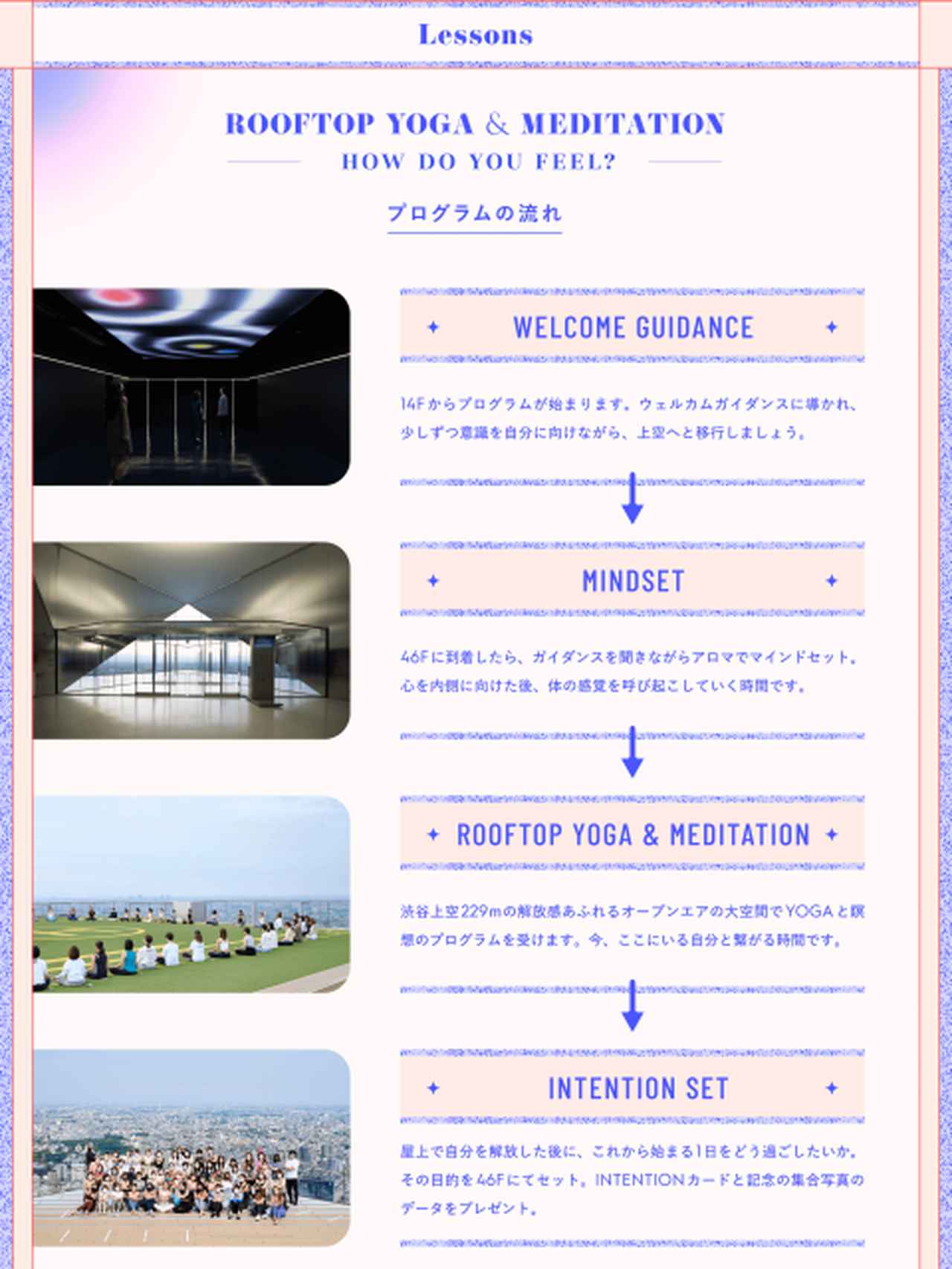 「Morning Activity ROOFTOP YOGA & MEDITATION」は「HOW DO YOU FEEL?」をテーマに、渋谷最高峰の解放感あふれる大空間で自分の内側に意識を向け、今の自分の感覚に気づき、今ここにいる自分と繋がる時間を提案。瞑想を取り入れたオリジナルプログラムで1日をスタートさせることができる。