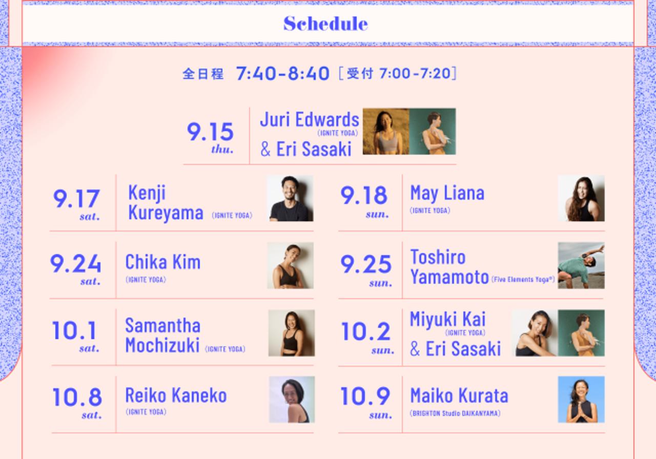 またIGNITE YOGA STUDIO主宰のJuri Edwards氏をはじめ、スペシャルゲスト講師陣によるレッスンが受けられる。