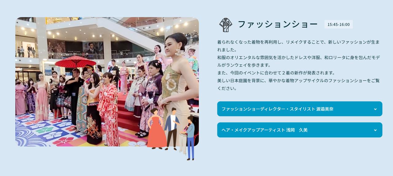 さらに、外を中心に活動の幅を広げられているファッションショーディレクターでありスタイリストの渡邉美奈氏、海外有名コレクションのヘアメイクにも参加されているヘア・メイクアップアーティストの浅岡久美氏協力のもと、着られなくなった着物を再利用しリメイクしたファッションを楽しむ、まったく新しいファッションショーも開催。