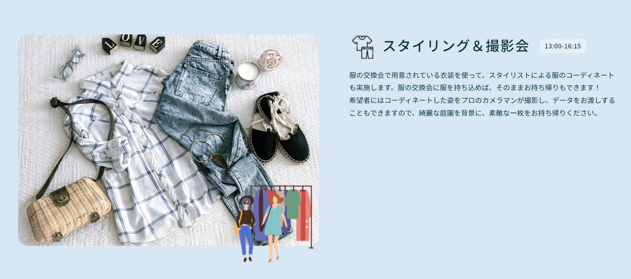 服の交換会で用意されている衣装を使って、スタイリストによる服のコーディネートも実施。服の交換会に服を持ち込めば、気に入ったコーディネートをそのままお持ち帰りすることも可能。希望者にはコーディネートした姿をプロのカメラマンが撮影し、データをお渡しすることも。