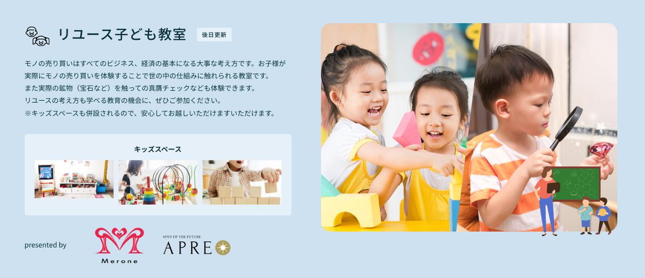 また、子どもたちが楽しみながらリユースの考え方を学べる「リユース子ども教室」も開催。実際にモノの売り買いを体験することで世の中の仕組みに触れられる教室となっている。また実際の鉱物(宝石など)を触っての真贋チェックなども体験できる。