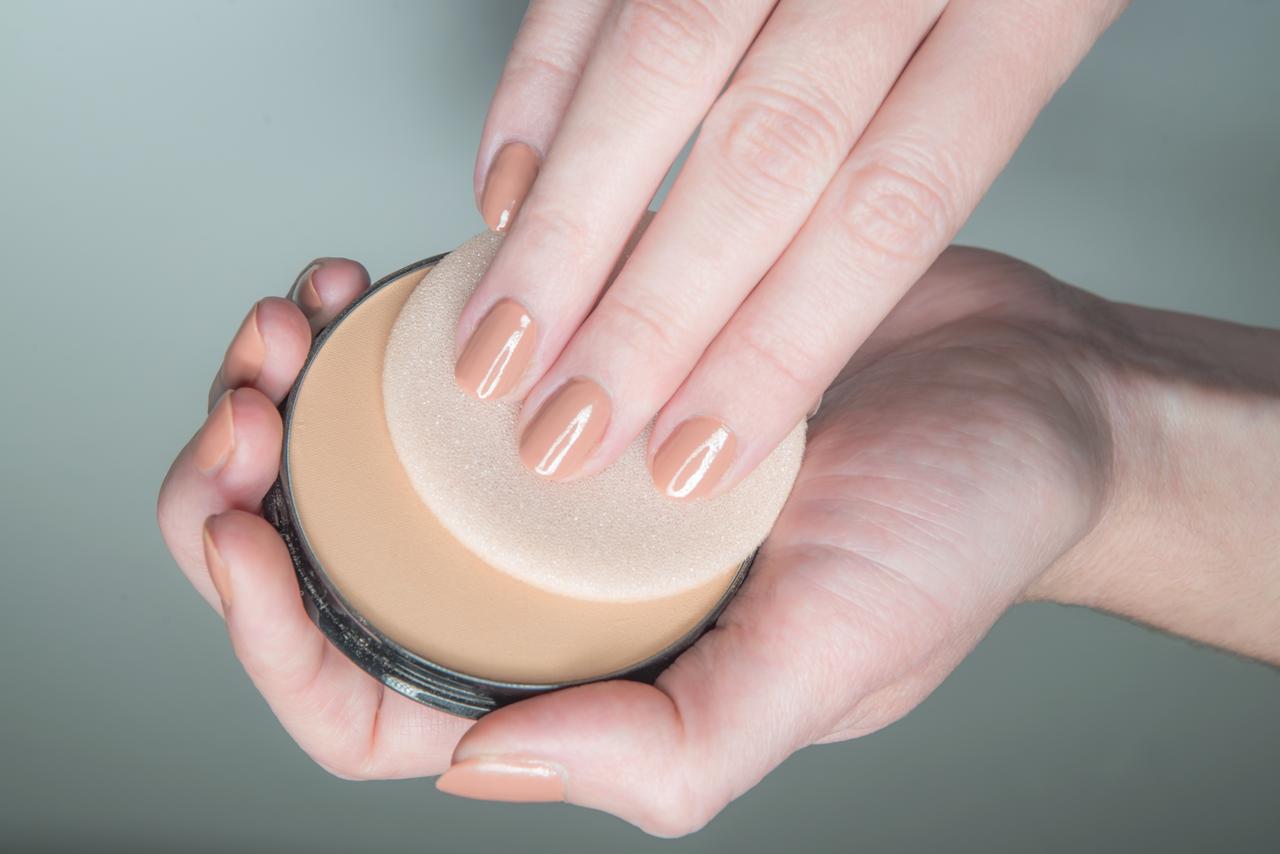 保湿クリームが肌になじんできたら、平らなスポンジにパウダーファンデーションをつけて、顔の中央から外側に向かってすべらせるように、先に鼻や口周りなど細かい部分から塗っていく。カロリーナいわく、カバー力が必要な部分を先に仕上げることで、厚塗りになるのを防ぐことができるそう。