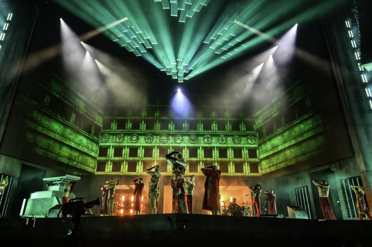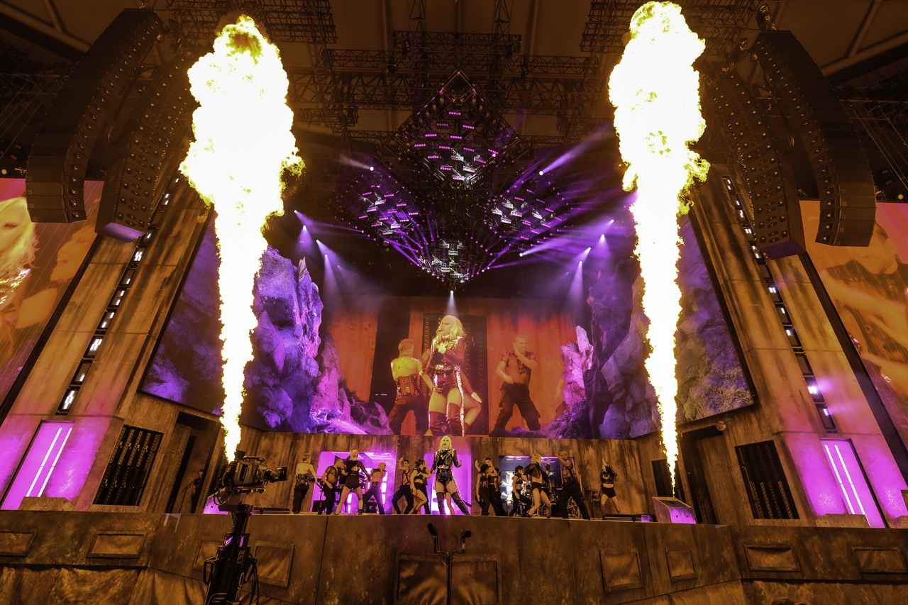 先ほどまでのヒット曲メドレーは挨拶替わりのパフォーマンスで、本番はここから。Act1の最初を飾ったのは、『Chromatica』から自由にしてほしいと歌った「Alice」。ガガが床に寝転がると、ステージのその部分が上下左右に移動。体制が不安定な状況でも、いつも通りの声量でパフォーマンスをするガガの肺活量のスゴさや体幹の強さに脱帽。