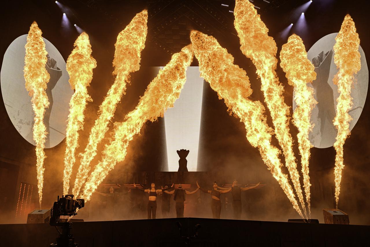 ガガの登場をじらすかのように、5分に渡り会場内に流れた映像。この映像で観客の期待がマックスまであがり、ストリングスのイントロが鳴り響くと、ガガの影が登場。
