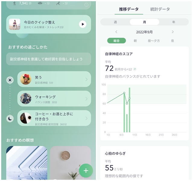そしてこの計測という習慣が、日々の自律神経の状態について考えるきっかけに。よい睡眠などに密接にかかわる自律神経に意識を向けることで、日々の過ごし方について再考することができる。ちなみに計測データはアプリ上に蓄積されるため、曜日や時間ごとにどういったゆらぎあるのかを知るのも可能。
