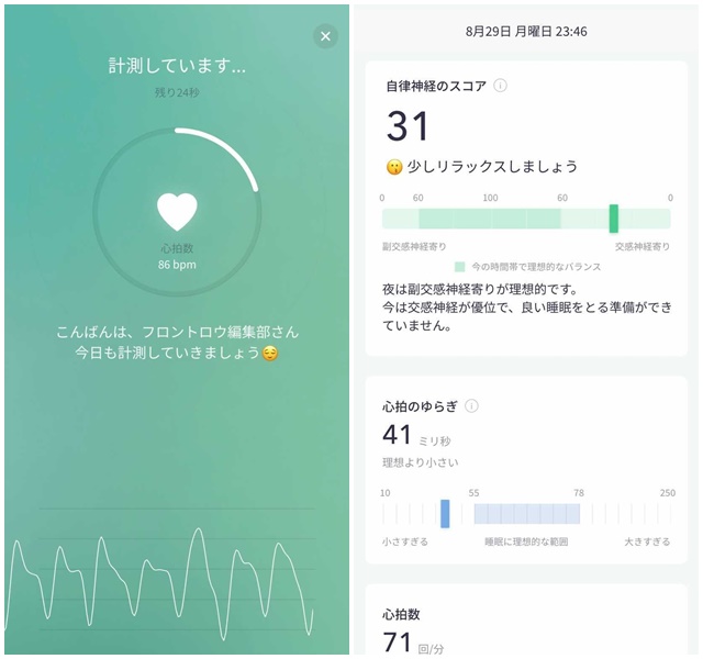 この自律神経の計測機能は、毎日夜にチェックしてみた。夜には自律神経は副交感神経優位になっているのが理想的であるものの、つい考え事をしてしまうこともあり、脳が興奮状態になることも少なくない。そういうときに計測してみると、理想的なバランスから崩れていることを実際に指摘されるので、その精度の高さには驚き。