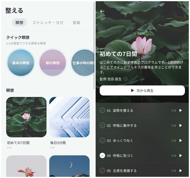 またその時々の心の状況に応じて、豊富な瞑想メニューから選べるのも嬉しいポイント。上記のクイック瞑想だけでなく、緊張をおさえるための瞑想や人生が上向く瞑想、パフォーマンス向上の瞑想など、その日に必要としているサポートを受けられる。
