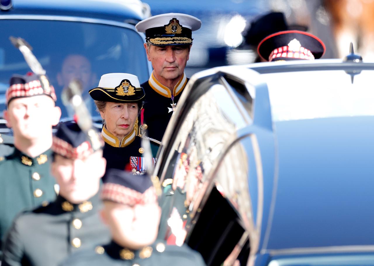 セント・ジャイルズ大聖堂へ向かうエリザベス女王の棺を乗せた車。アン王女は軍服で後ろを歩いた。