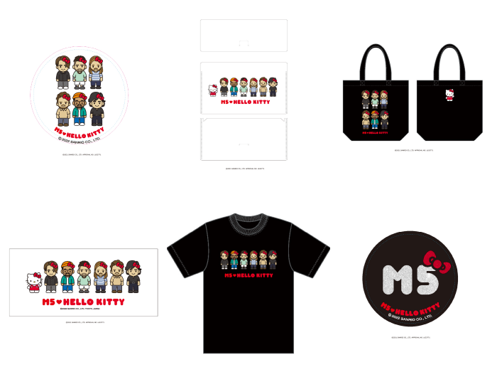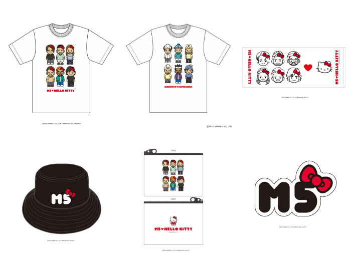 ラインナップが発表された際に特に反響が大きかったグッズが、株式会社サンリオとのコラボアイテムたち。マルーン5の6人のメンバーたちと、「ハローキティ」や人気キャラクターユニットである「はぴだんぶい」とのコラボレーションで、Tシャツやタオル、ポーチ、バケットハット、トートバッグなどが販売中。