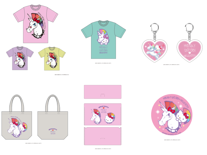 さらには、今回、フレンドリー・ユニコーンもサンリオと初コラボ! パンクにインスピレーションを得たレインボーのユニコーンがキティちゃん風にデザインされたTシャツや、ユニコーンを被ったキティちゃんのTシャツ、ユニコーンから顔を出すキティちゃんが描かれたトートバッグや缶バッジなど、こちらも見逃せないアイテムばかり。