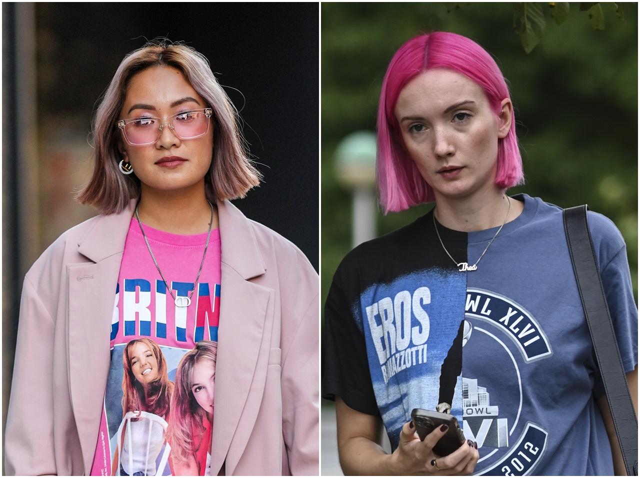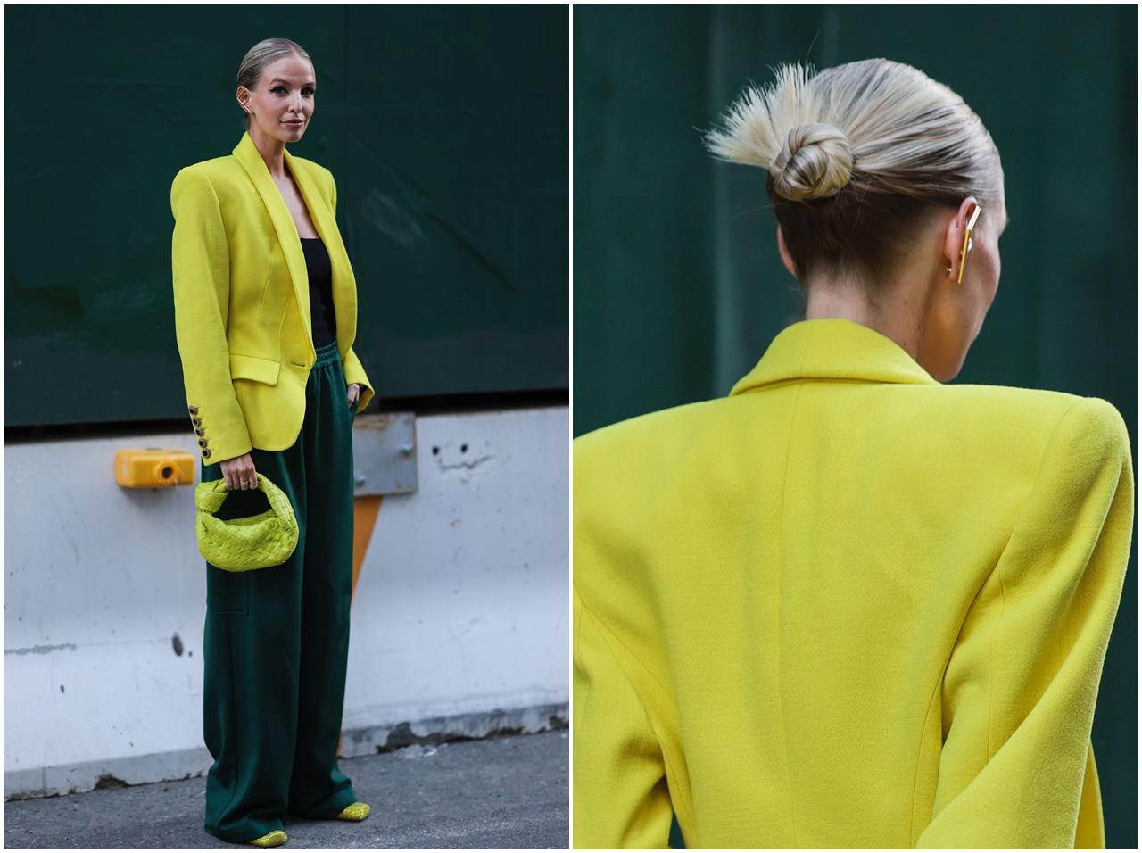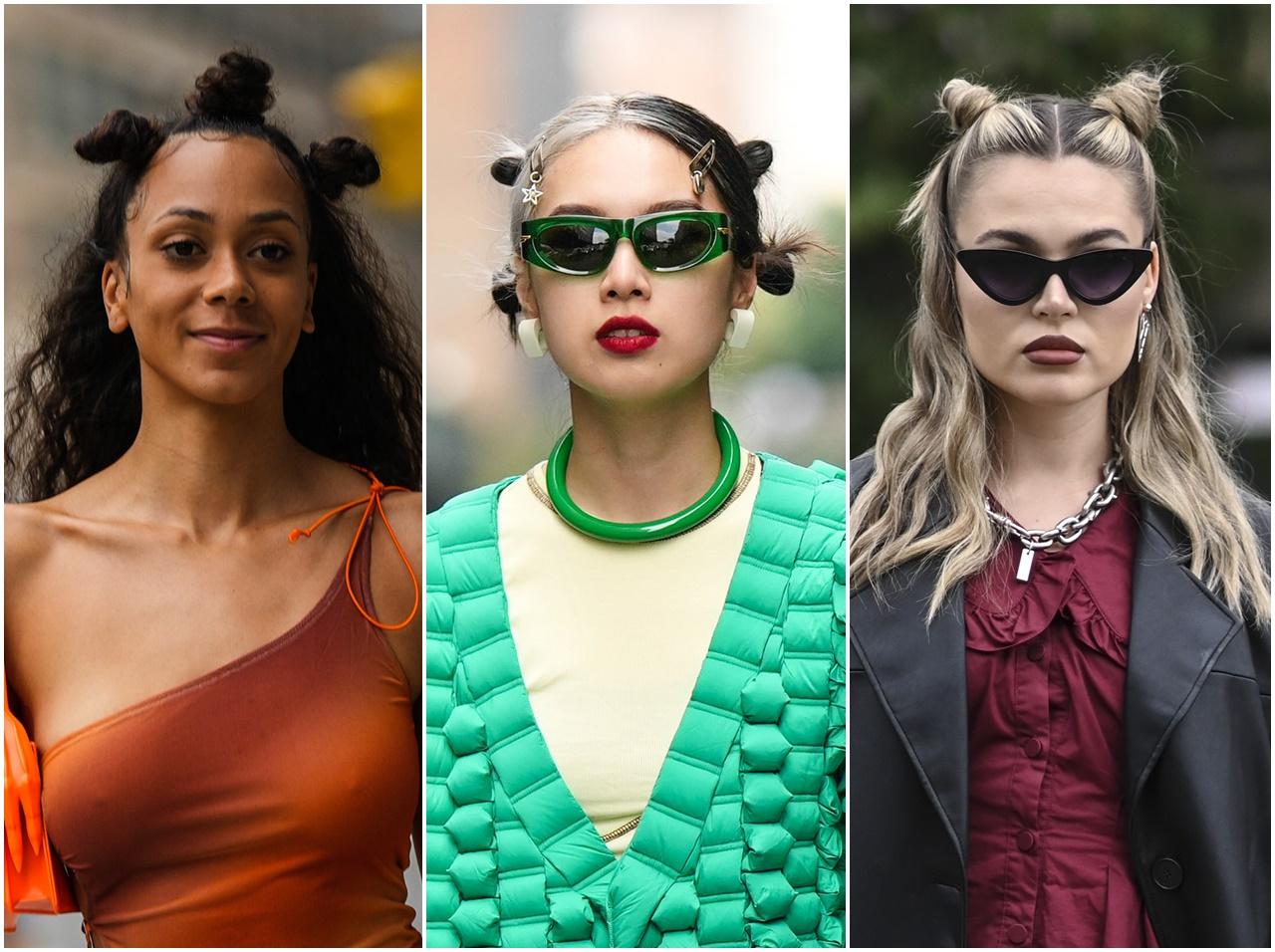 ツンツンヘアとならんで多くのファッショニスタが披露したのが、超ミニサイズのシニヨンを複数つくったヘアアレンジ。左右1つずつシニヨンをつくってツノっぽく見せるアレンジや4つ以上のシニヨンをつくったアレンジで個性をアピール。