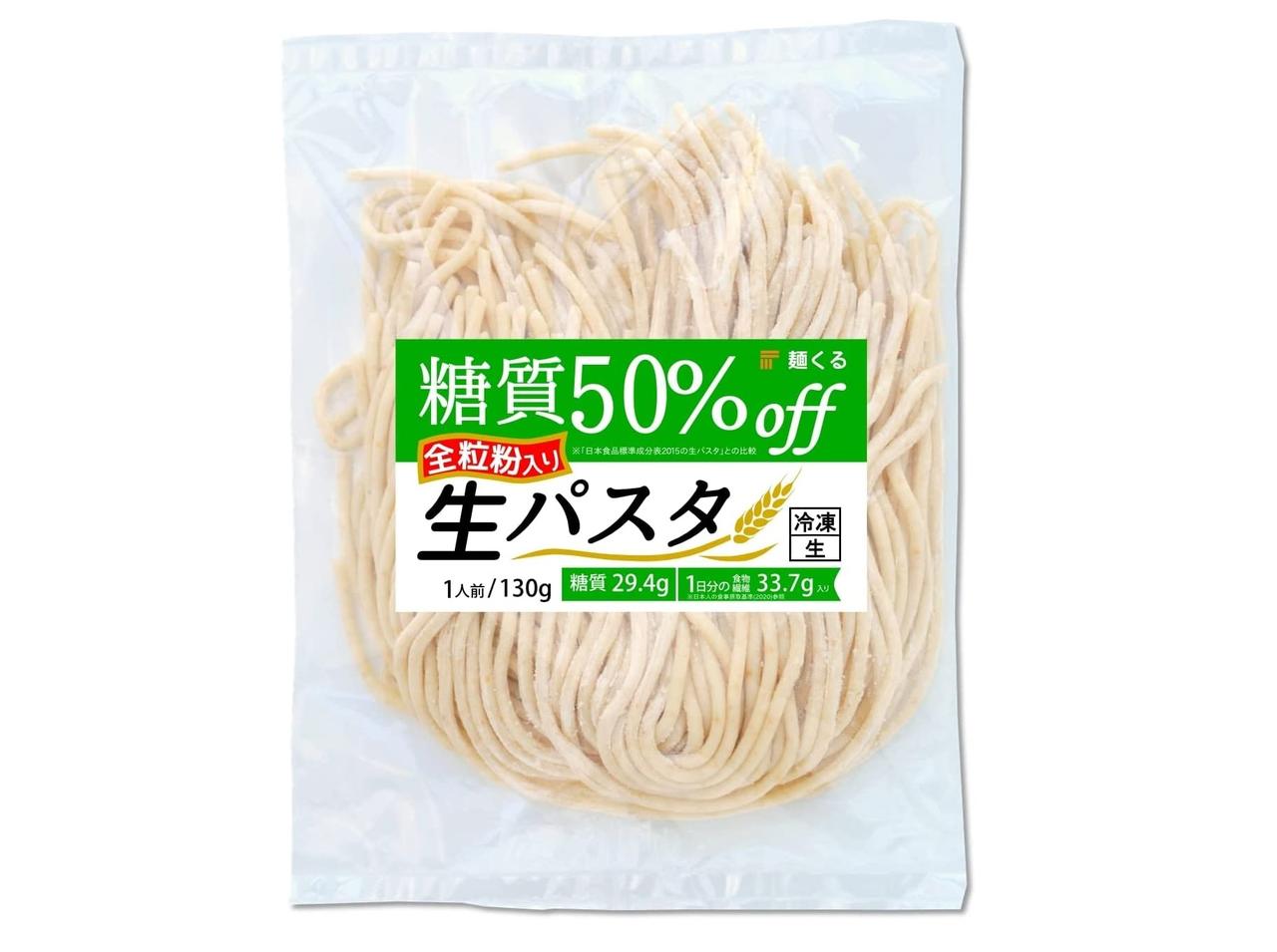麺くるの「糖質50%オフ 生パスタ」は、小麦由来の難消化性でんぷんを配合し、糖質50%カットを実現した低糖質生パスタ。低糖質パスタにありがちなクセがなく、どんなパスタとも相性抜群。レタス約10個分の食物繊維が含まれているので、腸活したい人にもダイエットしたい人にもオススメ。