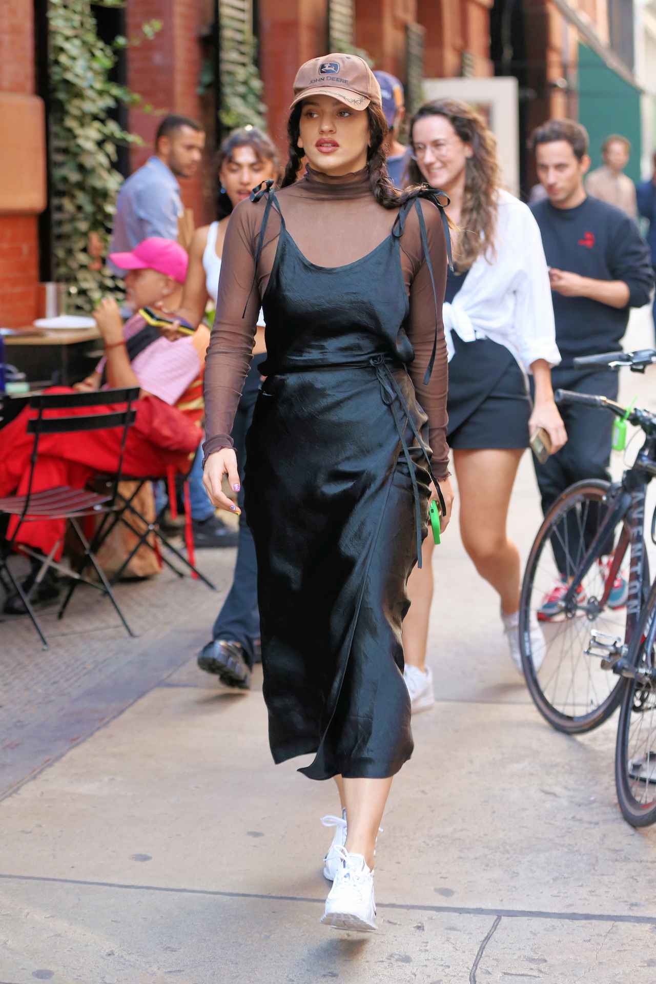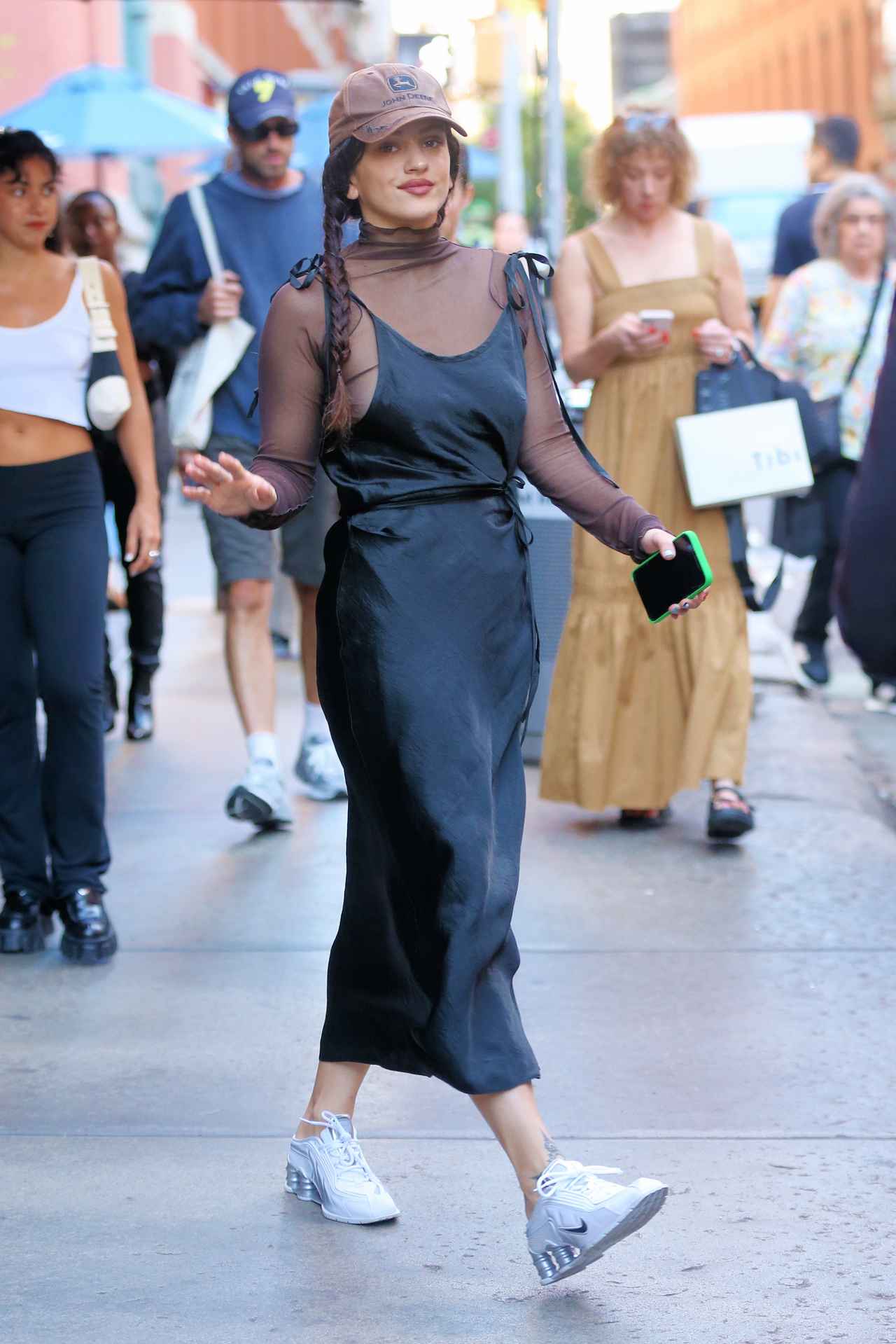 3枚目のアルバム『モトマミ』を冠したツアーでニューヨークを訪れていたラテン系シンガーのロザリア。ツアー後にニューヨークの街へと繰り出したロザリアは、シースルーのブラウントップスに黒のサテンワンピースを合わせた少しモードな装い。