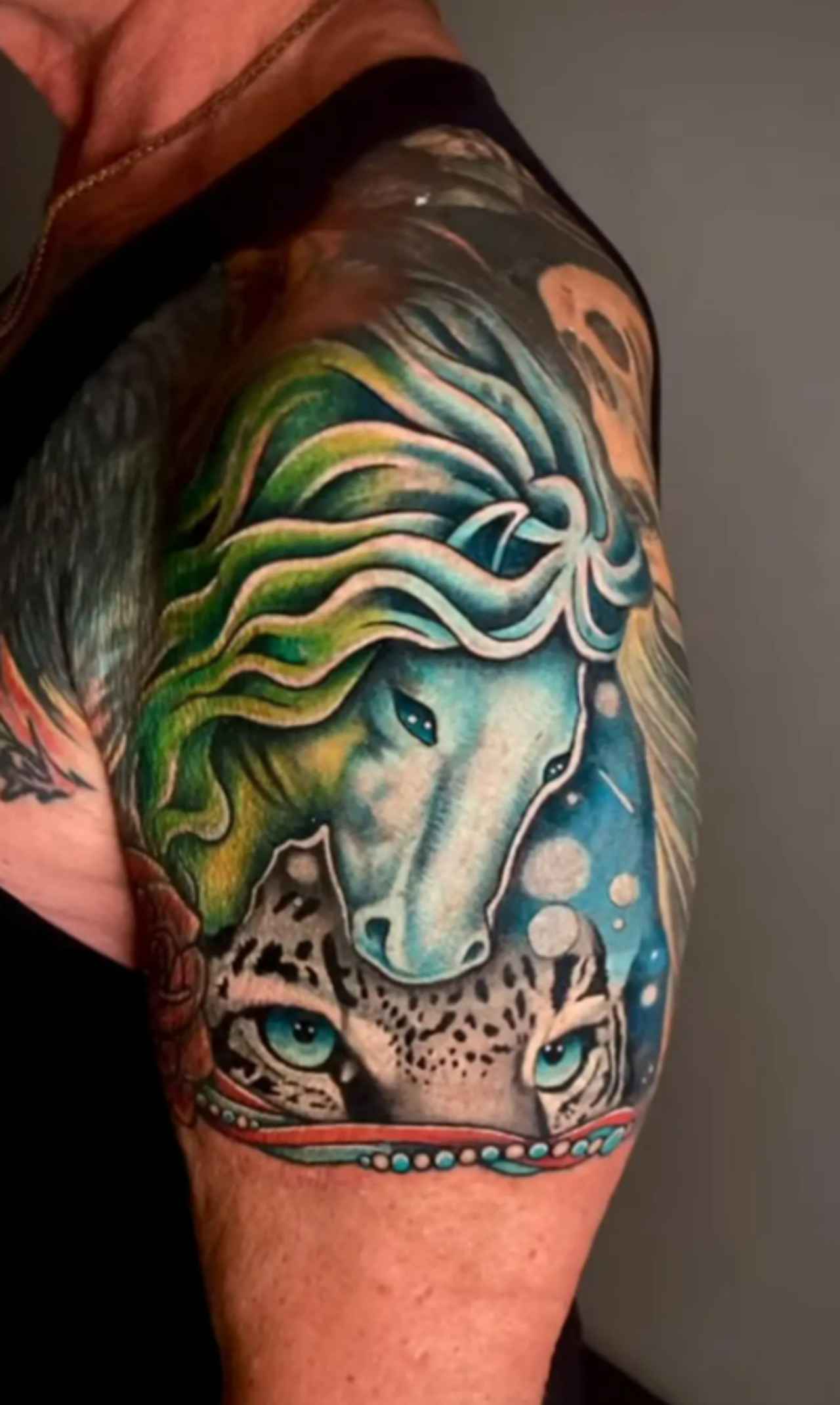 彼の腕にはジェニファーの目のタトゥーが入っていたのだが、彼はこれをヒョウの目のデザインに変更。さらに、その上にある馬のタトゥーもあわせて、色を入れたよう。