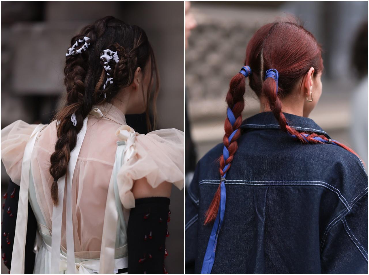 ロンドン・ファッション・ウィークでひと際目を引いたのが、細めのリボンを使ったおさげヘア。編み込みや三つ編みにリボンをプラスするだけで、ぐっとオシャレ感がアップ。