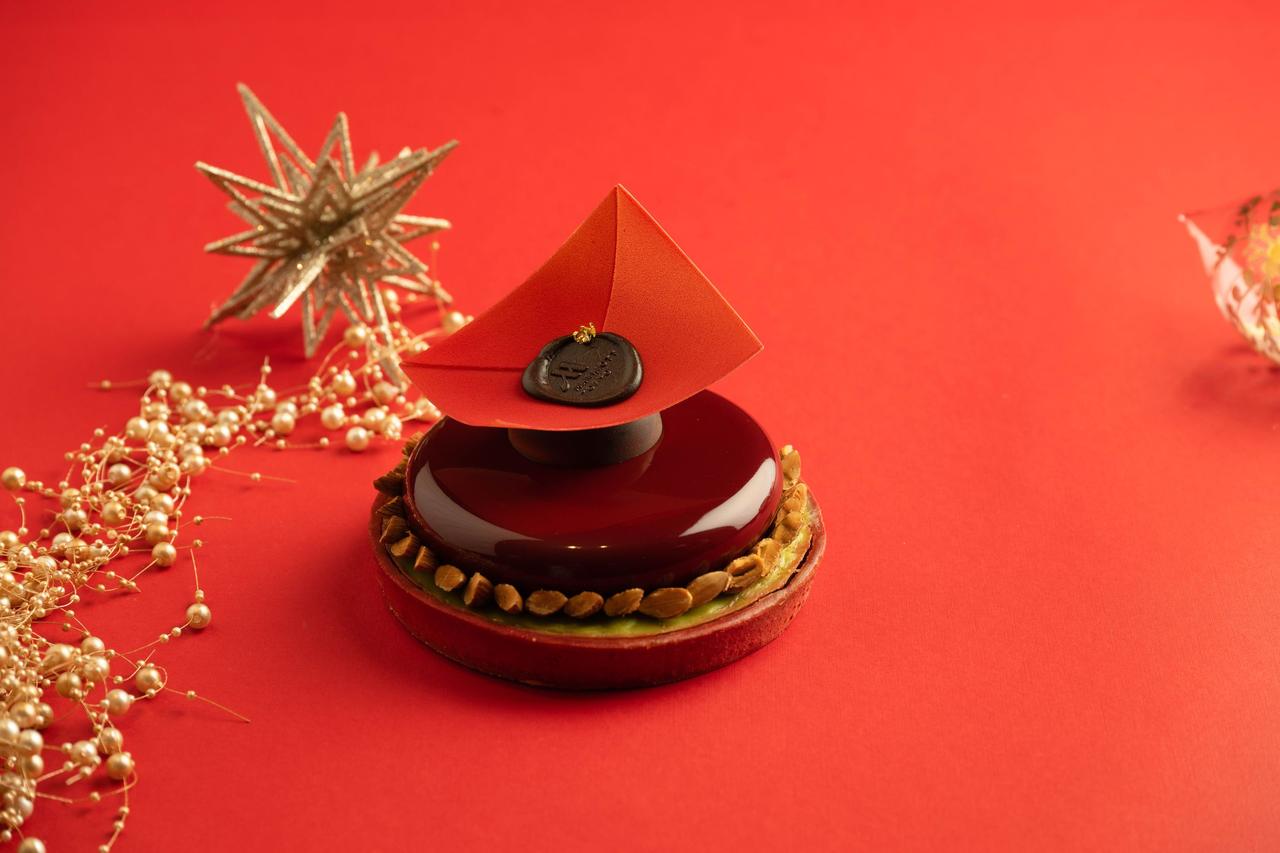 深紅が印象的ないちご風味のチョコレートムースに、コクのある濃厚なピスタチオガナッシュを合わせたタルト。いちご・ピスタチオ・チョコレートの織りなす味わいのハーモニーを堪能できる。トップにあしらったチョコレートは、サンタクロースへの願い事を秘めた手紙をイメージ。パティシエの遊び心が垣間見える一品。