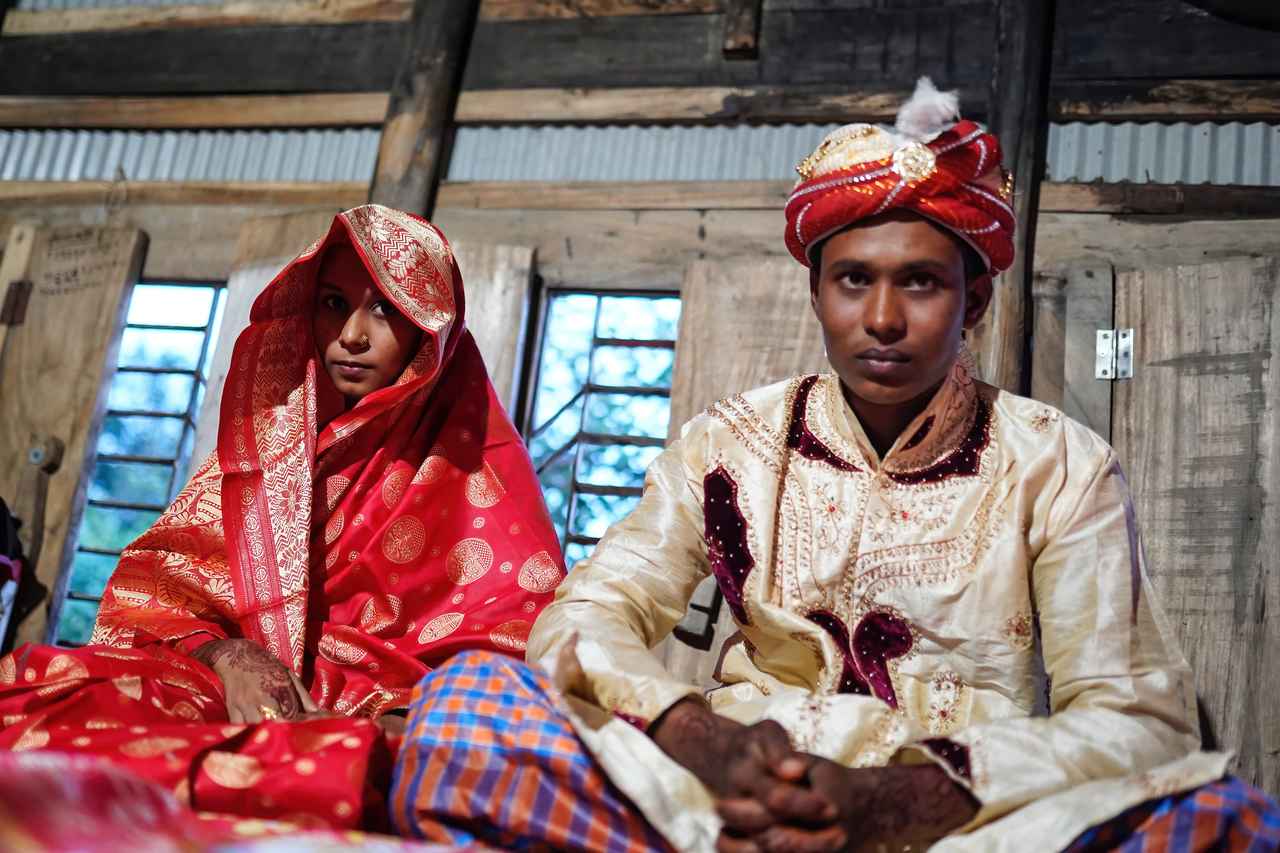 経済的悪化が児童婚につながる例。2021年9月、バングラデシュでの18歳男性と14歳少女の結婚式。バングラデシュでは、新型コロナウイルスの流行が社会と経済に大きな影響を与えた結果、多くの家庭が極度の貧困に追い込まれ、児童婚が13%増加した(BRAC発表)。
