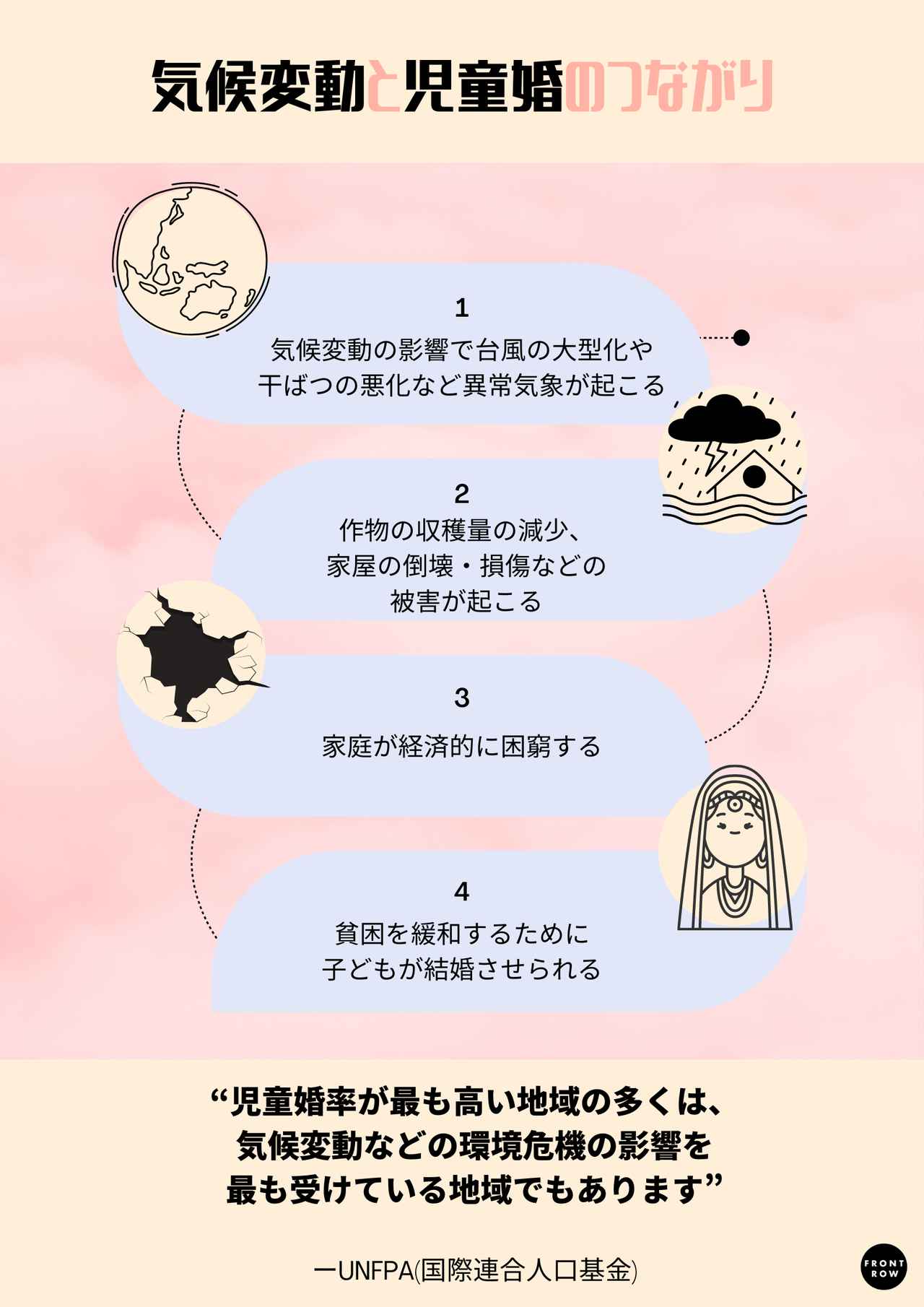 ①気候変動の拡大は、台風の大型化や干ばつの悪化といった自然環境の変化につながることが広く知られている。そういった異常気象のなかで、②作物の収穫量の減少、家屋の倒壊や水没、新たな疫病の発生といった被害が起こりやすくなる。そしてそれが、そういった地域で暮らす③家庭の経済的な打撃に繋がる。そうなると、④家庭で養う人数を減らすために幼い子どもを結婚させる家庭が増える。なかには、生活費を稼ぐために金銭と引き換えに娘を結婚させなくてはいけない家庭もあるという。