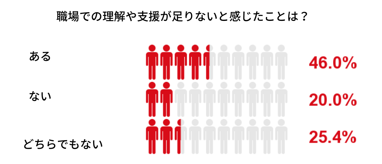生理中の仕事に関しては、業務の効率が落ちることだけでなく、周りの理解が得られないことに悩む人も多数。「生理前後や生理中の悩みについて、職場での理解や支援が足りないと感じたことはありますか?」という質問に「はい」と答えたのは、全体の半数近くにあたる46%だった。