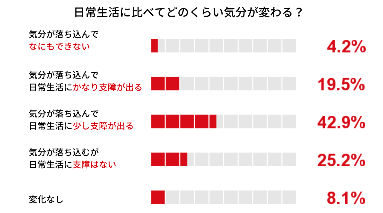 気分の変化を感じている92%のうち、気分の落ち込みによって日常生活に支障が出ると感じている人の割合は66.6%。その中でも4.2%の人は、何もできないほど気分が落ち込むことが分かった。