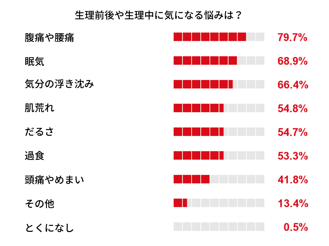 お腹や腰の痛みに次いで多かったのは「眠気」と「気分の浮き沈み」で、どちらも60%以上の人が実感。「肌荒れ」「過食」「だるさ」といった悩みを選択した人も半数以上にのぼった。またその他の回答としては、便秘や下痢、お腹のハリなど腸に関する悩みが多数。吐き気や不眠、むくみが気になるという人も。