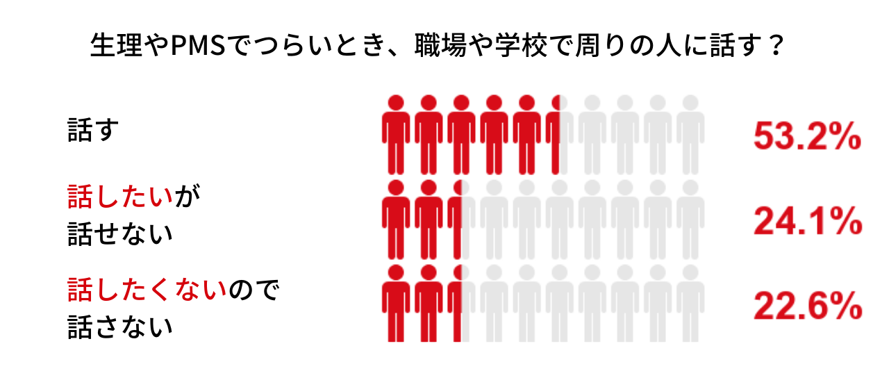 このようにほとんどの人が心身への影響を感じているにもかかわらず、その辛さを打ち明けにくいのも生理ならではの問題。「生理やPMSなどでつらいとき、職場や学校で周りの人に話しますか?」という質問では、4人に1人が「話したいが話せない」と回答した。