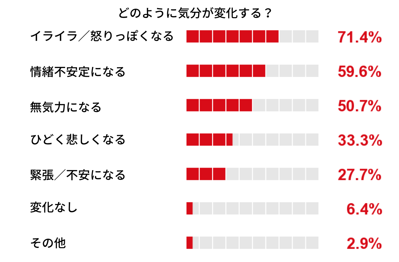 さらにフロントロウでは変化する気分の種類も調査したところ、1人につき1種類ではなく、平均2.5種類の気分の変化を感じていることが明らかに。もっとも多かったのが「イライラや怒りっぽくなる」という回答で71.4%。次いで「情緒不安定になる」「無気力になる」という人が多かった。