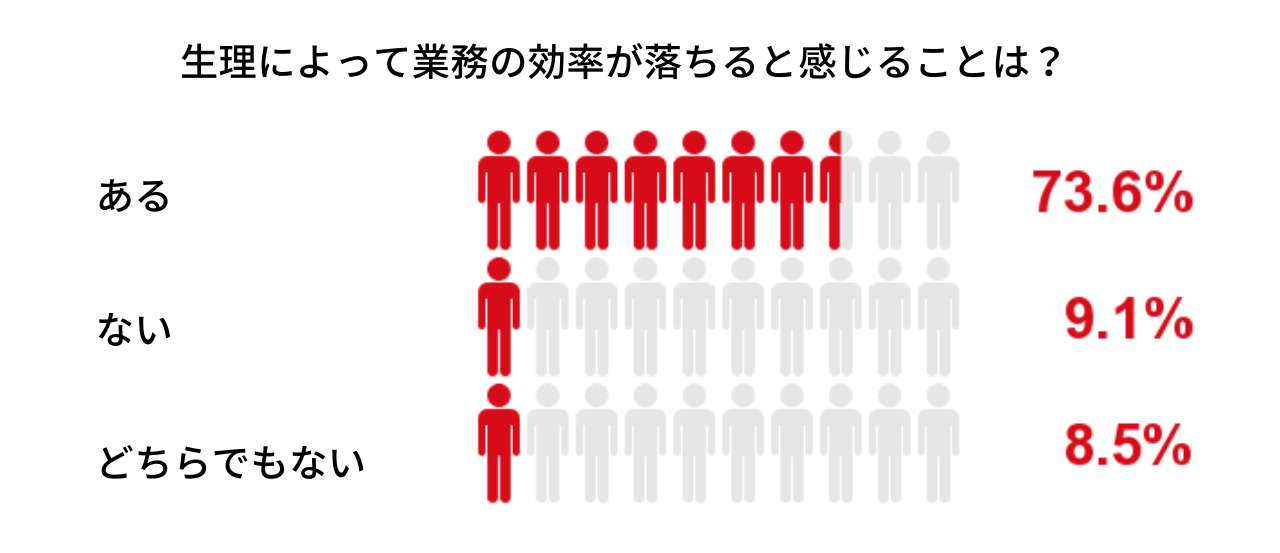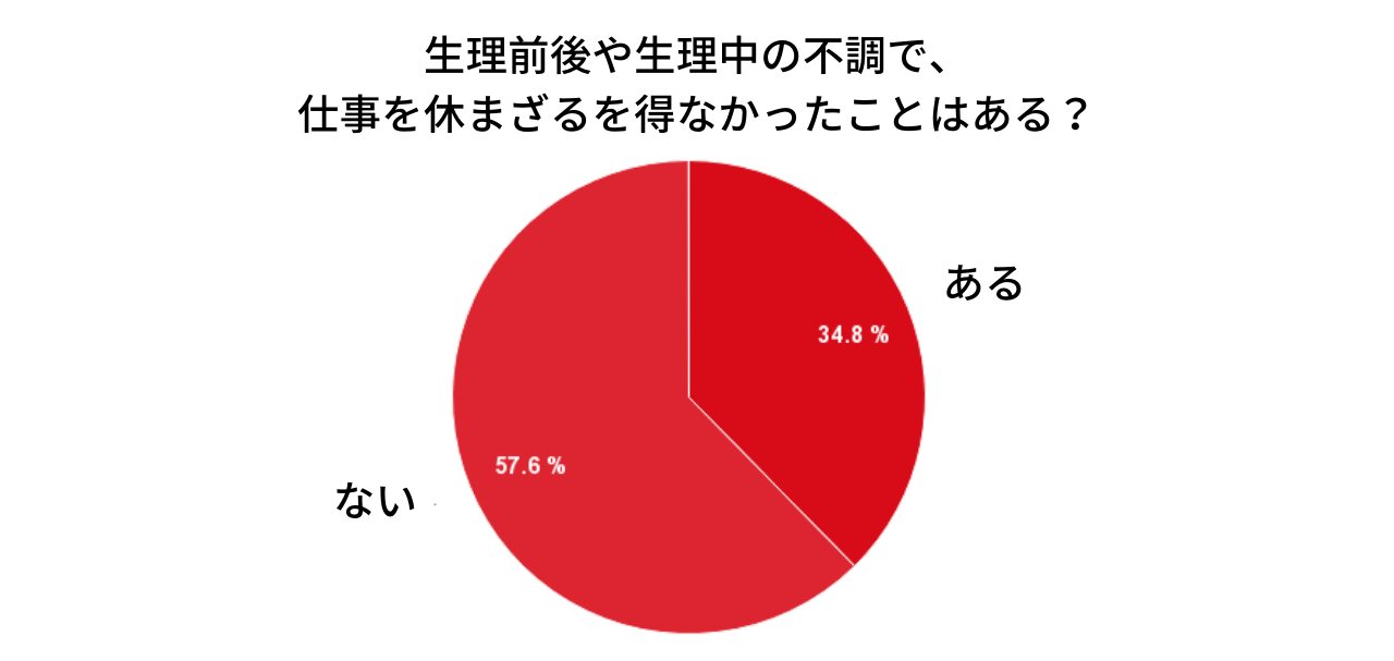 仕事をしている人は、生理の不調によって業務に身が入らないことも多い。「生理前後や生理中の悩みについて、業務の効率が落ちると感じることはありますか?」という質問では、「はい」と答えた人が73.6%。また生理前後や生理中の不調で、仕事を休まざるを得なかったことがある人も34.8%にのぼった。