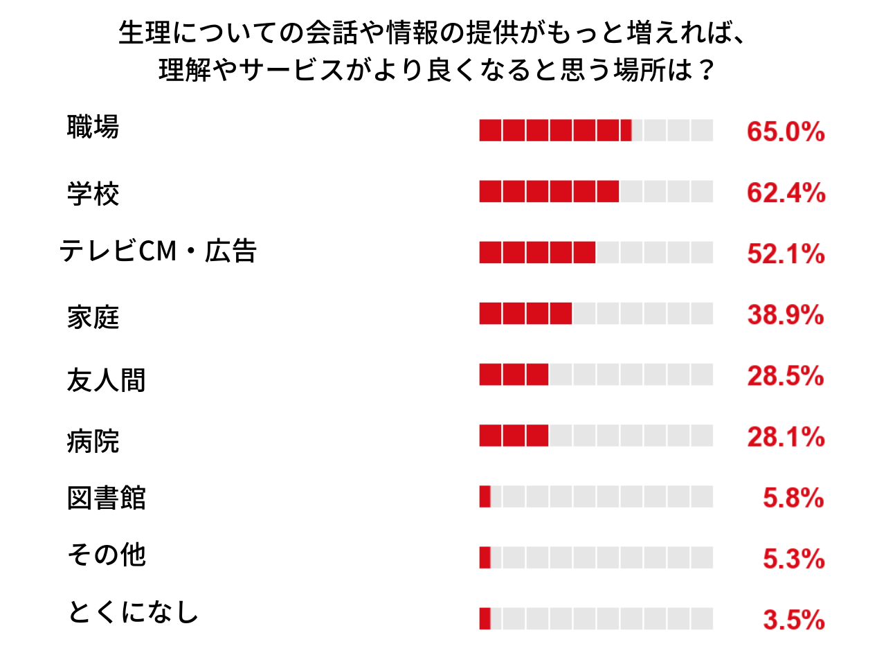 また、生理についての会話や情報の提供がもっと増えれば、理解やサービスがより良くなると思う場所について聞いたところ、職場と答えた人はもっとも多く65%。職場は人生の多くの時間を過ごす場所だからこそ、生理が見て見ぬふりされている現状に違和感を抱く人が多いことがうかがえる。また会話が増えてほしい場所については、職場のほかにも学校や広告、家庭などを挙げる人も多く、生理についての教育や会話が足りていないと感じている人が多いことがわかった。
