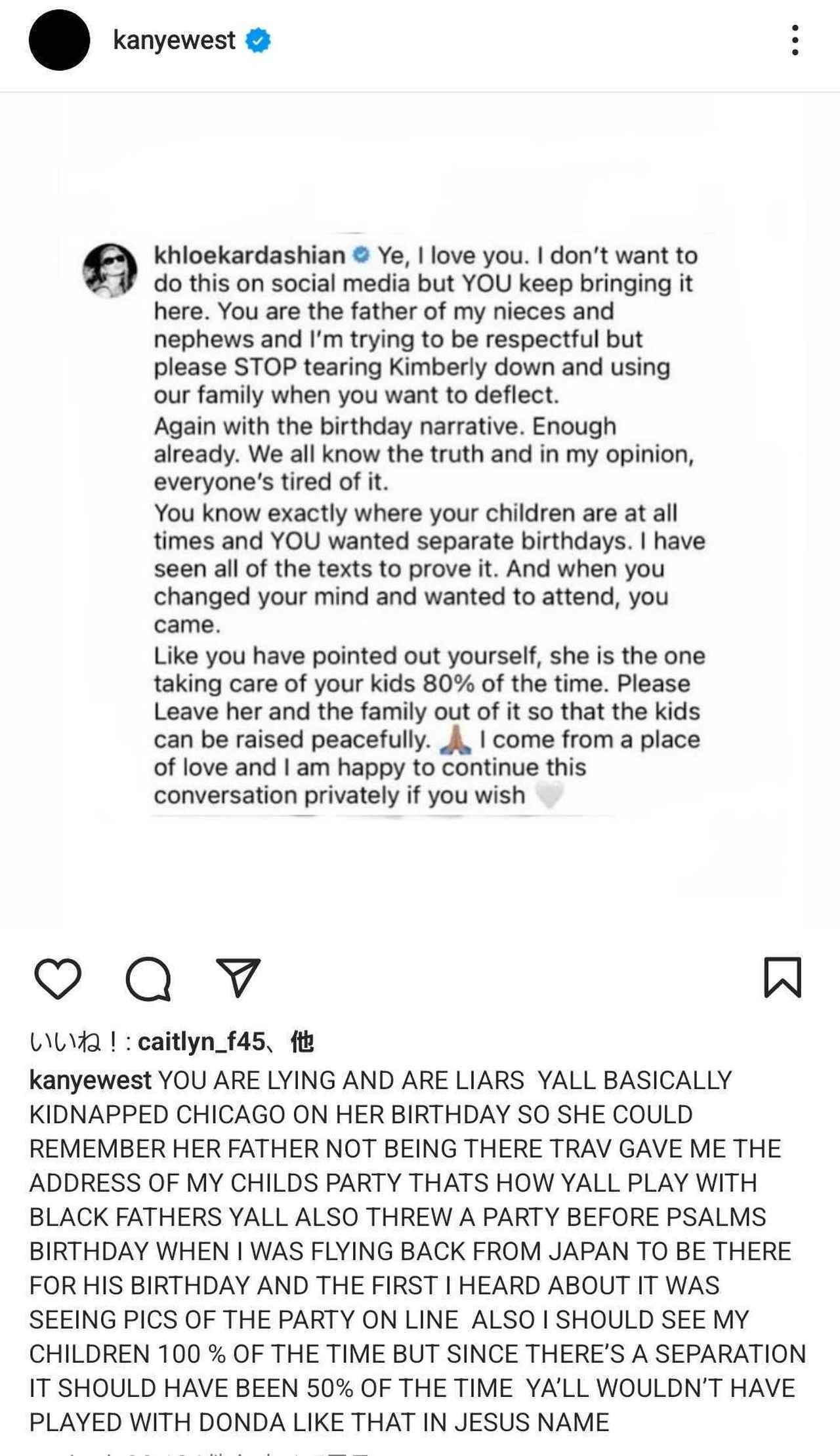 「イェ(カニエの改名後の名前)、愛してる。ソーシャルメディアでこんなことしたくないけど、あなたがいつもこの場でやるから。あなたは私の姪や甥の父親であり、私は敬意を払いたいと思っているけど、何かから話題をそらしたいときにキンバリー(キムの本名)を傷つけ、私たちの家族を利用するのはやめて。また誕生日の話。もういいから。みんな真実を知っているし、私が思うに、みんなうんざりしていると思うよ。あなたは子どもたちの正確な居場所をつねに知っているし、別々の誕生日会を行なうことを望んだのはあなた。私は、それを証明するメールを全部見ている。そして、あなたの気が変わって出席したいと言ったとき、あなたは実際に来た。あなたが自分で指摘しているように、子どもの世話の80%をやっているのは彼女。子どもたちが平穏に育てるように、彼女やこの家族をそっとしておいて。私は愛をもって言っていて、あなたが望むならプライベートな場所でこの話を続けましょう」